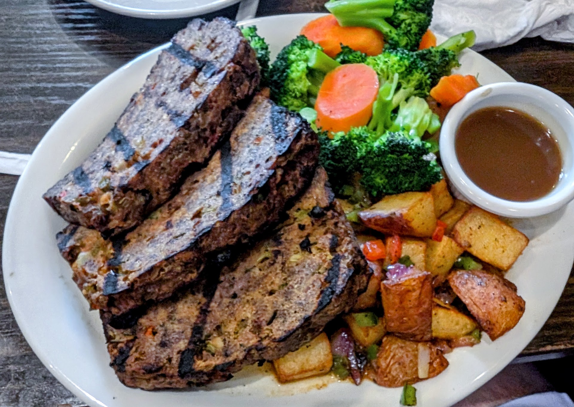 I got the Cajun meatloaf and it was a massive plate. 3 big slabs, I couldn't come closer to finishing it. The table also had the tuna melt, BBQ burger, and rib tip salad. Everyone seemed to enjoy their food. The meatloaf had an interesting flavor, mostly standard but with a cumin-y kick. The gravy came separate in a little bowl and I should have asked for more because it was a tad dry. But definitely tasty. The veggies were solid too.