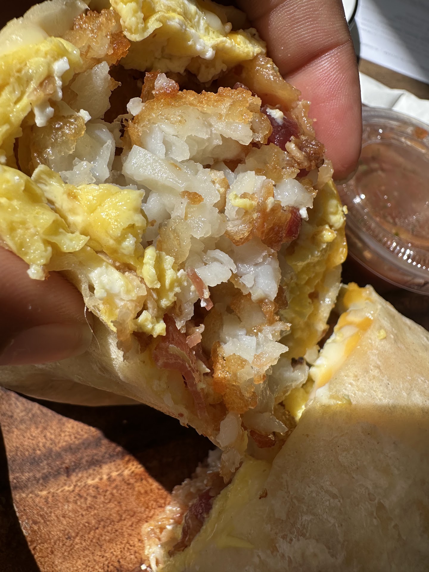 I ordered the bacon breakfast burrito with tater tots, cheese, and scrambled eggs. I'm really picky about my breakfast burritos and this one was superb. I was 100% satisfied. It wasn't overstuffed and the ingredients were high quality--the bacon in particular was really tasty.