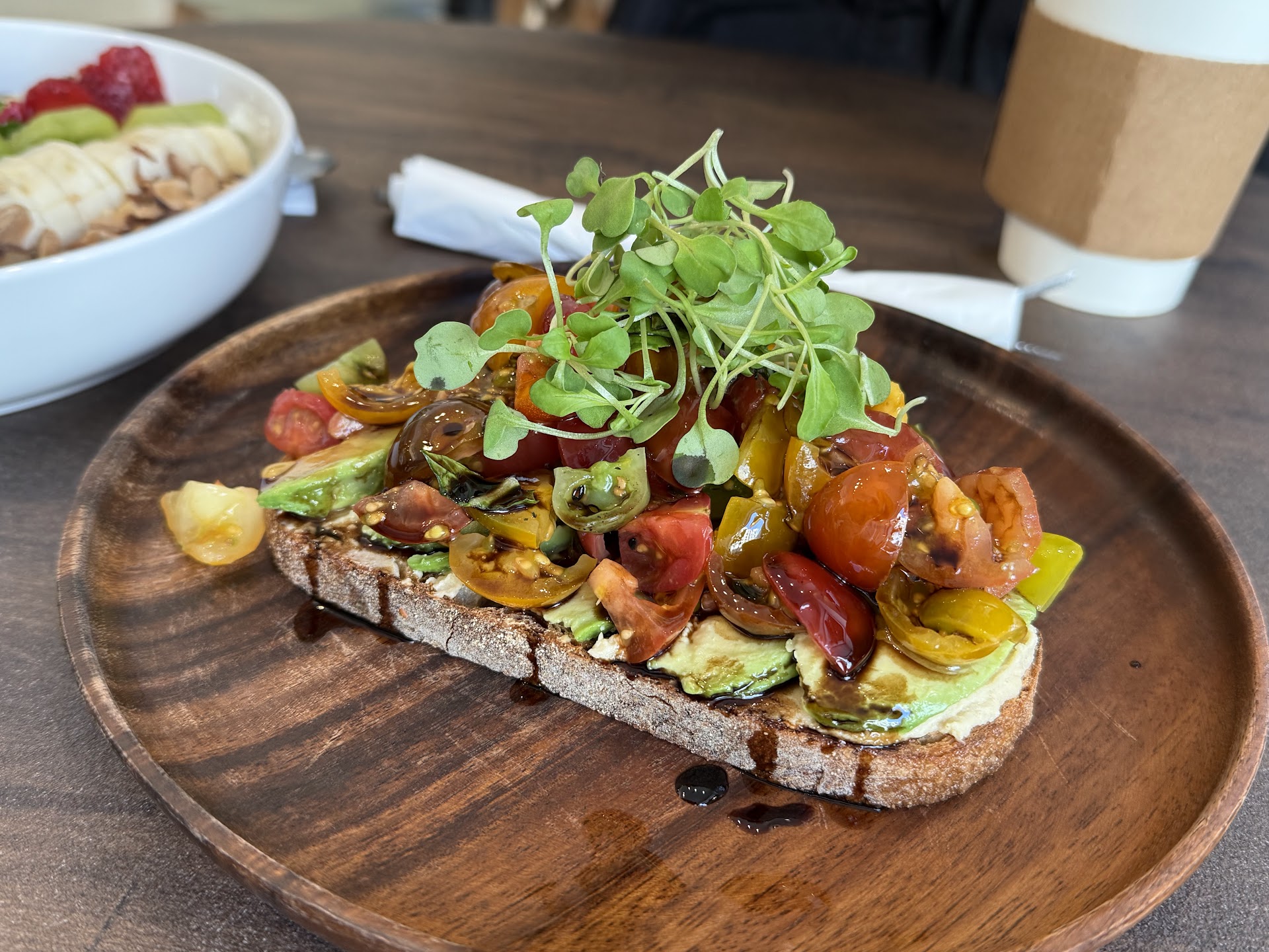 I had the avocado toast with cherry tomatoes and microgreens – hands down one of the freshest and most flavorful toasts I’ve ever had. The heirloom tomatoes were bursting with flavor, and the balsamic drizzle tied it all together perfectly. I also tried a hearty breakfast plate with steak, sautéed mushrooms, eggs, and a fresh tomato salad – everything was seasoned and cooked beautifully.