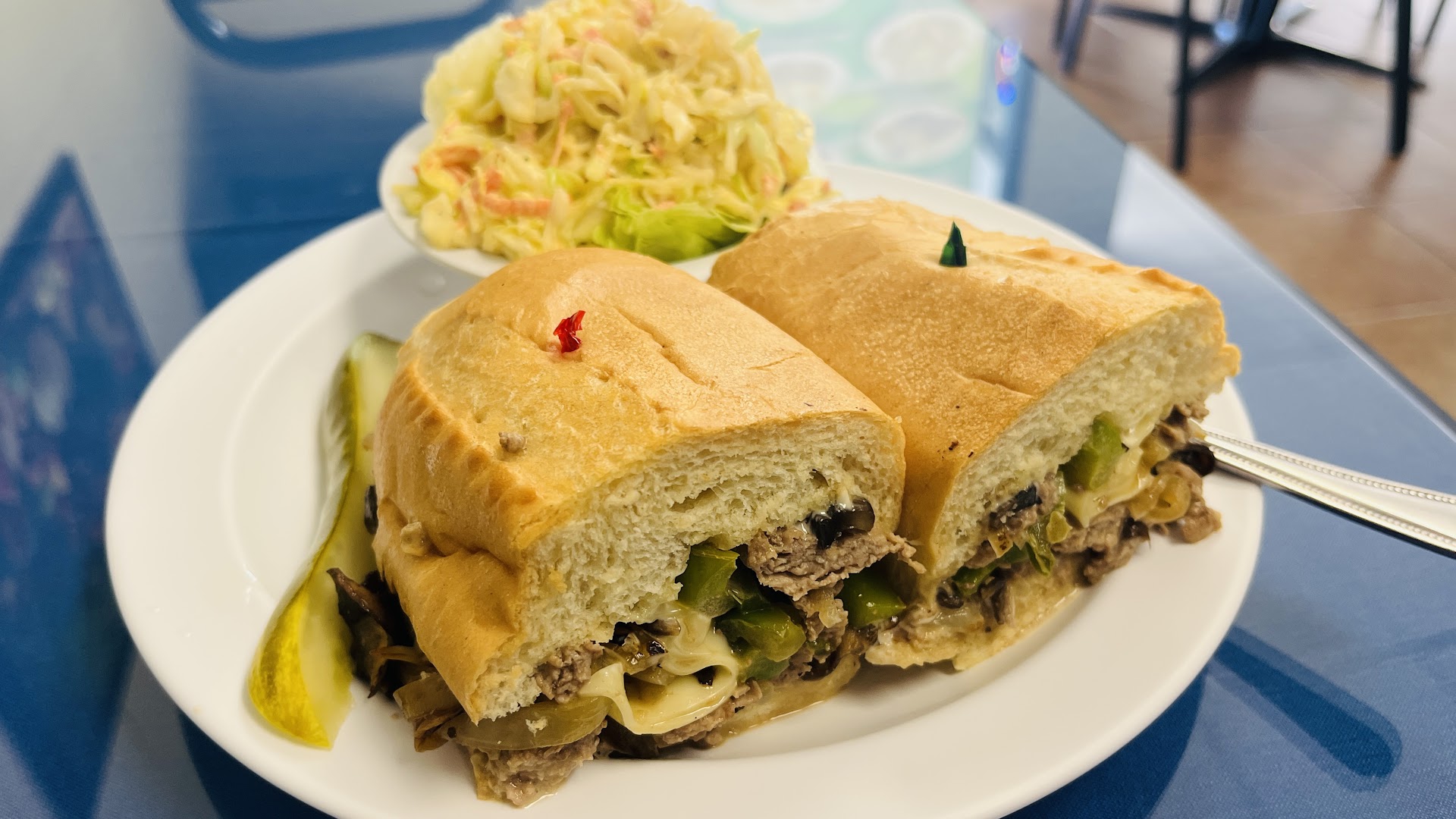 Read moreThis place was on my list of "must visit" places. So I was driving by and decided to give it a try. Small restaurant, very clean, with photos of the menu. That turned me off right away but I decided to stay - maybe the food would be great? I went with Philly cheesesteak - I tried it a lot of different places and I know the good one taste. The order was ready in few mins. Decent size, good looking and presentation was great. The sandwich was very bland. Not tasty at all. This is the one your dad would do not knowing how. The coleslaw was good - fresh, and moderately sweet. When I finished the first half of the sandwich the second got soaked. The temperature inside was 80 degrees according to the AC controller and it felt rather uncomfortable on a hot day. And they charge me $19 for a medium size bland sandwich and medium size decent coleslaw. Its not tasty and overpriced. 3 stars would be the best score for this place but the price was brutal so 2 stars and I am...