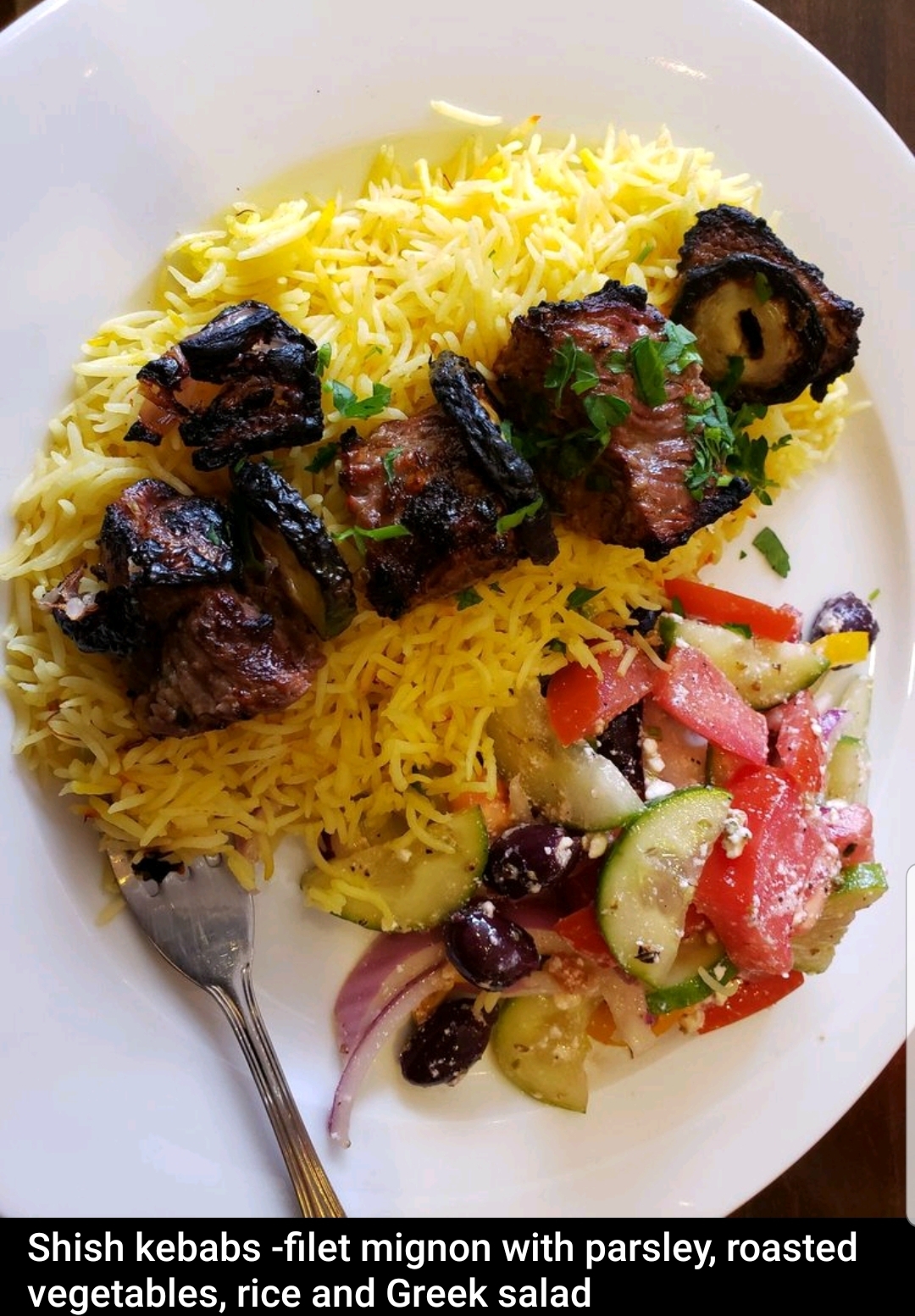 The salmon kebabs are my favorite. The falafel is the best I've ever had. And the tzatziki sauce is incredible. The pitas are lightly grilled which gives them an ever so slight smoky taste= wonderful. I havent tried the chicken or lamb, but the shish kebabs, made with filet mignon, are amazing. They are served with roasted vegetables, rice, and a Greek salad. I literally am sad to stop eating. Their food is so good. The Greek salad is a mix of cucumbers, olives, tomatoes, feta tossed in olive oil and herbs. It was delicious. I highly recommend it; you'll forget you're getting your veggies in. Their roasted veggies are also amazing.