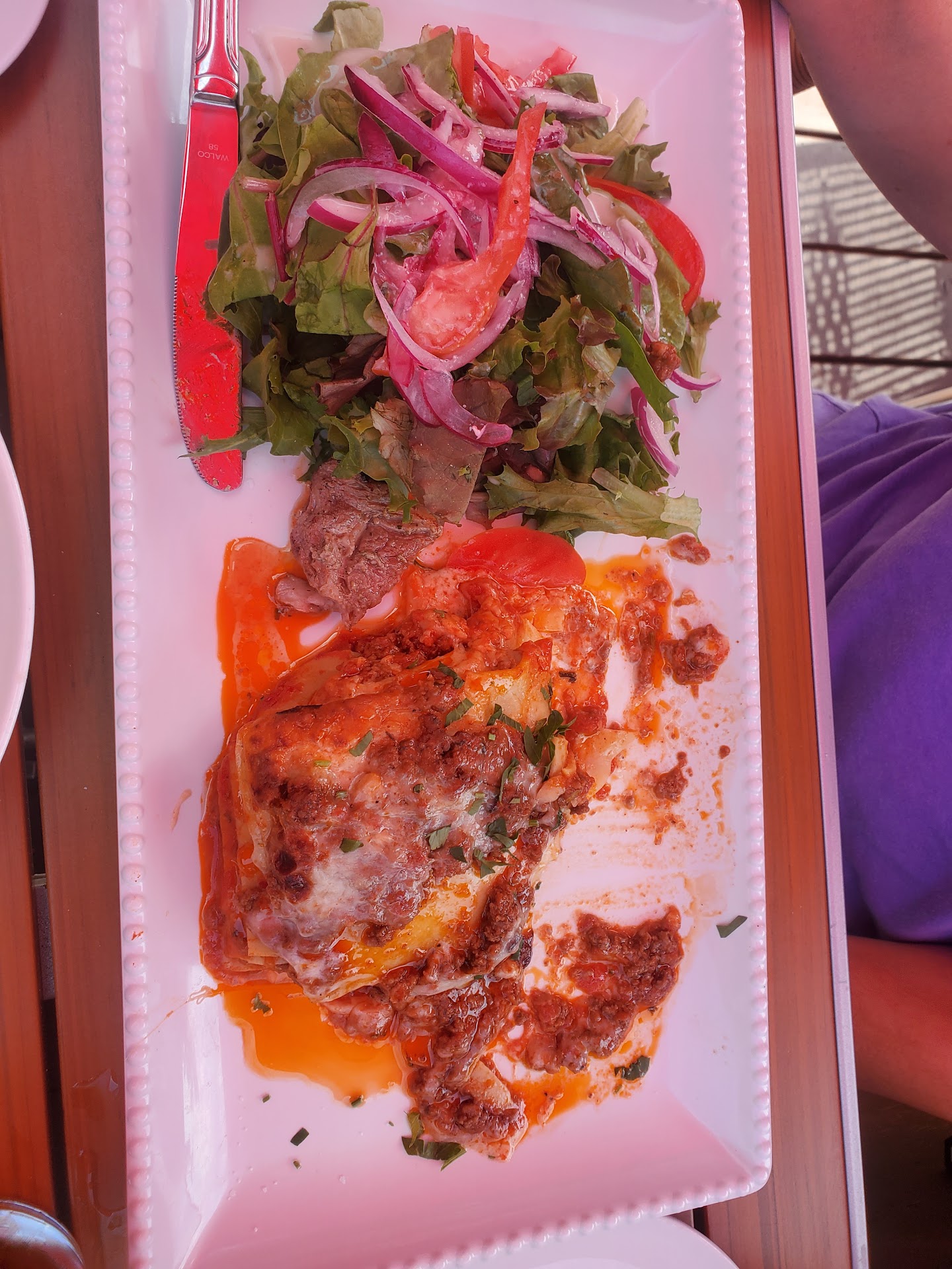 Read moreCame here on a really hot Saturday even though the Long Beach area is NOT really cooler than Los Angeles. They have comfortable patio seating on the sidewalk where the street traffic is not threatening. Their menu is Mediterranean, which is a mix or Middle Eastern & Italian. Service was friendly but not very attentive. Had to go into restaurant to get ordered iced tea and then straws. My friend ordered the Lasagna($14), Iced Tea($2) and I got Lamb Chops w/roasted veggies with Tabbouleh Salad($20), and we shared the Calamari Fritti(($12). Quite reasonable prices. The Calamari were very good but the menu said they came with a SPICY marinara but it was just bland so they brought me some chili oil(surprise!) that was quite spicy & good. The Lamb Chops(3) were perfectly cooked and delicious but the Tabbouleh salad was not the traditional with bulgur and parsley but a variation w/semolina 'beads' and almost no parsley. To his credit, the owner(I assume) served our food and said no problem if I wanted to change the salad. Didn't taste it till he left and it was OK, a bit bitter, but I was enjoying the lamb chops and got full. My friends lasagna was a large portion but flavored differently that from an Italian place and she said it was just OK. She got a nice salad with it. I would go back for the lamb chops alone but there were other items on the menu I would...