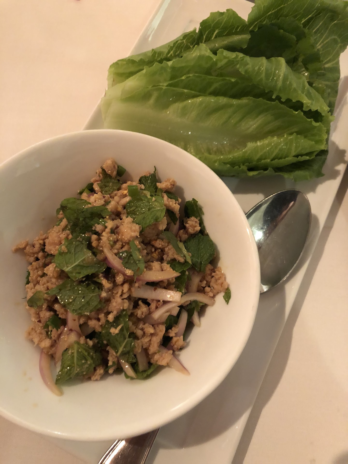 We ordered the chicken larb, crispy duck, and garlic ginger rice. Everything was delicious and on point, particularly the larb which came with the most perfect Romaine lettuce leaves. Where did this pristine lettuce come from in the middle of February?