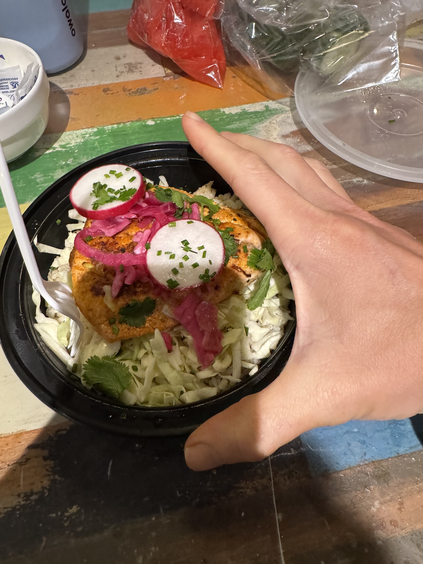 Here’s what $31 bought me: • One small square of salmon – dry, aggressively overcooked, possibly once frozen in 2018. • A mound of plain shredded cabbage – not a slaw, not seasoned, just sad, raw cabbage. Like someone dumped coleslaw mix and forgot the “slaw.” • Two thin radish slices – for the illusion of “gourmet.” • A few pink pickled onions – fine, but not enough to distract from the rest. • A dusting of chives and cilantro – because someone in the kitchen went to a Chipotle once. • No real sauce, no dressing, no grains, no warmth.