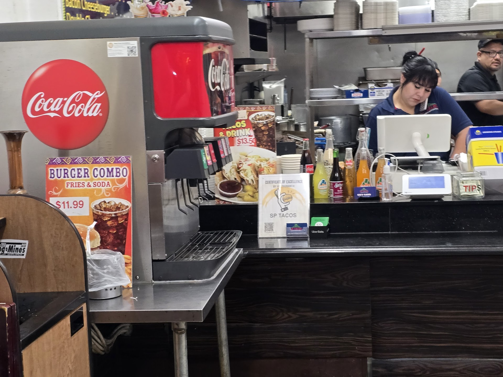Once inside, I ordered two tacos, and the service was quick. I paid with a credit card, and my food was ready in no time. The tacos were decent, and the staff behind the counter were very friendly and welcoming.