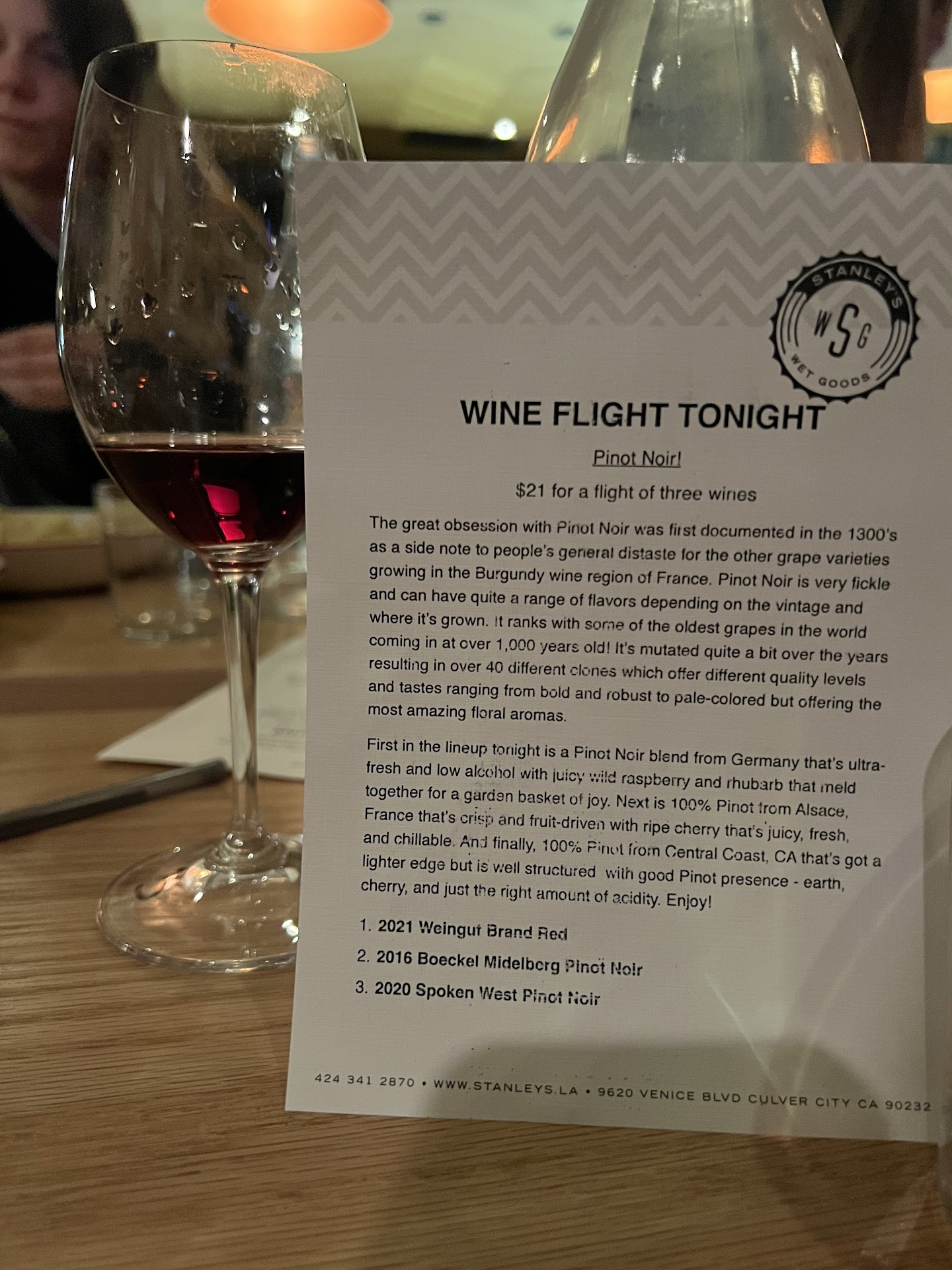 Wednesday is a great night to visit Stanley’s Wet Goods in Culver City if you enjoy wine tasting flights at local wine bars.