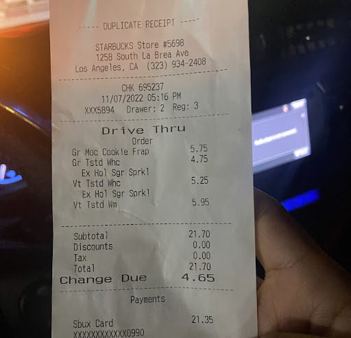Read moreSo I got there at 5:16 pm I ordered 2 white toasted hot chocolates and one white chocolate mocha as I’m driving back headed towards Washington and la brea, I try my grande toasted white chocolate it was mocha coffee. I can not have caffeine I’m currently pregnant so I try all the warm drinks and there all white mocha coffee. I drive back even though there’s hella traffic and the register girl who ringed up my order was being really rude !trying to be smart and the night shift we’re debating inside through the window whether they were gonna replace my drink. I would understand if I said my order wrong but I asked her for the receipt because she was giving me a hard time and she got the order wrong again this is unacceptable i wasted my time and my money !!! As u can see my receipt this very unacceptable I shouldn’t have to feel stressed about fighting or arguing with a Starbucks worker !!! I hope I get the manager to reply back because it was distasteful and disrespectful. I even had to second guess if I should of gone back a second time again for a new order ! Why did you’re night shift staff felt so entitled whether they were gonna replace my drinks or not it’s was there mistake. And I did not drive back with intention to give them a hard time . But she decided to give me a pregnant customer...