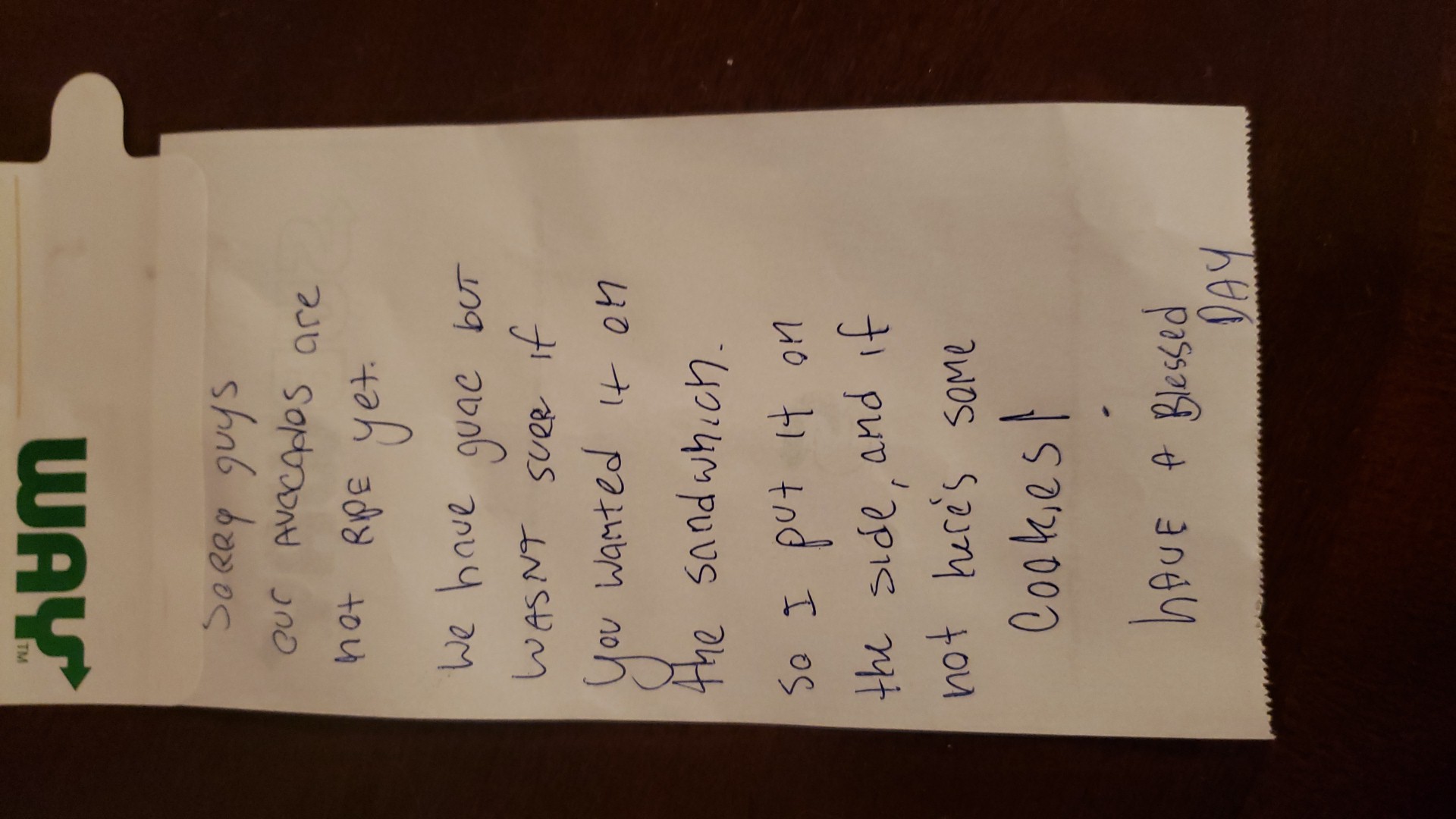 Read moreDuring these times where Ubereats and other delivery services are king I placed an order through a delivery service but it didnt give me much choices on breads. I know what subway offers but Postmates was only allowing me to pick Italian (boringgggg). So I called and verified with Chris that he would change the bread type to what I wanted (Italian herb and cheese). Little things like that make a huge difference. Also I have attached a note left in our order due to them not having avocados which we paid for in the app. That's customer service! Thank you...