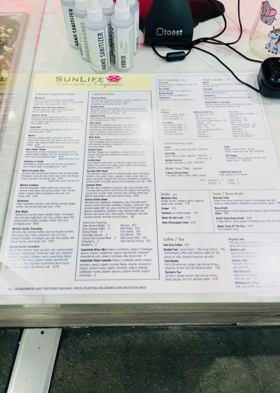 Since working close to the Westfield Century City Mall, I'm finding myself going daily to try all of the different little food and drink spots. Sunlife Organics is a juice bar that offers an array of healthy drinks and acai. They not only offer these items, but they also offer “a way of life fueled by the belief that you matter”. I love that!
