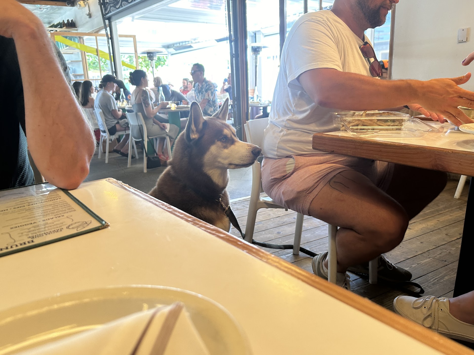 Dogs. (dog lover here btw) Dogs everywhere - INSIDE. I was led to my table on my most recent visit and had to step OVER a giant dog to get to my seat. It was one of two huge dogs brought by the table next to mine. I got a table eye-level interaction with someone's hungry pooch (see photo). Dogs were barking, dogs were begging, dogs were being dogs. I love animals, but c'mon. I had no idea restaurants could allow dogs inside - I thought dogs were limited to outdoor patio areas.