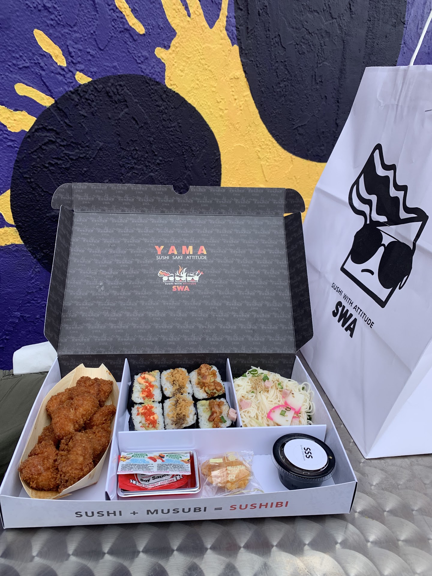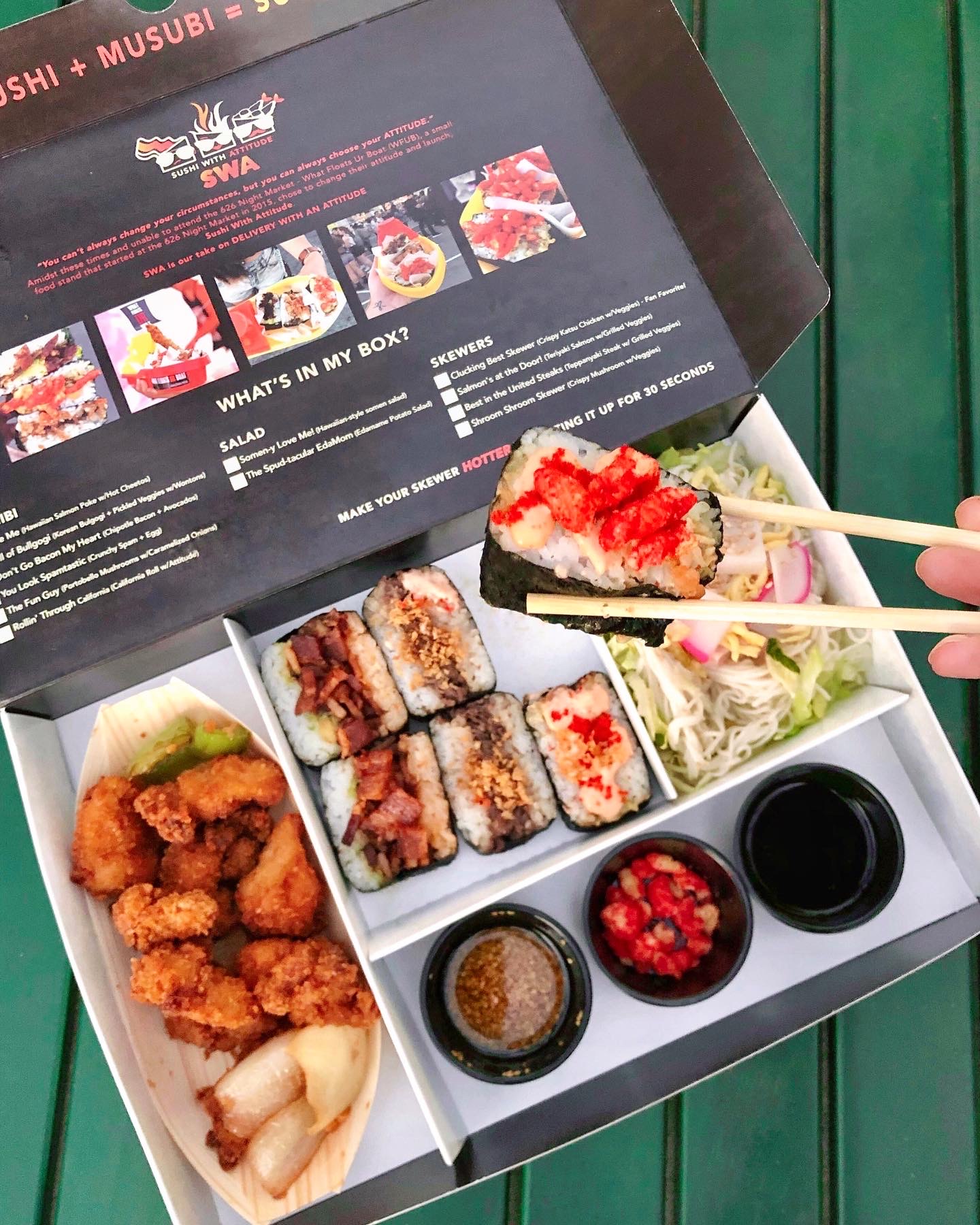 I went to Sushi with Attitude, they started from the 626 market which is cool. I got their most popular musubi box. It came with 3 different types of musubi (SUPER TINY PIECES - 1 bite and gone!) The musubi pieces were not worth the price but for the 'experience' sure... The soba salad was super underwhelming, the skewers were delicious. The box is huge so it seems like you're getting a lot, but really you're not so up to you.