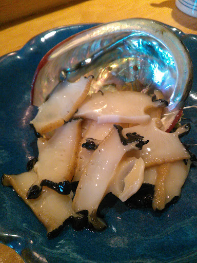 Red Abalone was served raw sliced in its own shell. The al dente textured meat was trimmed w/ black edging & had a natural slipperiness & touch of sweet ocean minerality. Also flame seared soft, bitter liver & parts of the abalone.