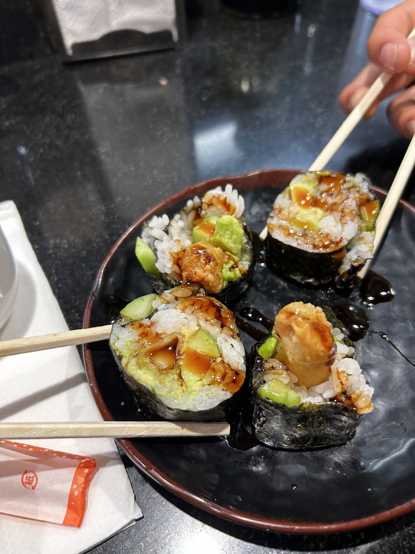 While it is a great spot to hit up for cheap sushi, it's by far not the freshest. I also found the rolls a little rice heavy and lacked the finesse of really good sushi rice. I would recommend sticking to the basic rolls, sushi, and sashimi. While the speciality rolls are more interesting to look at, they didn't quite deliver...