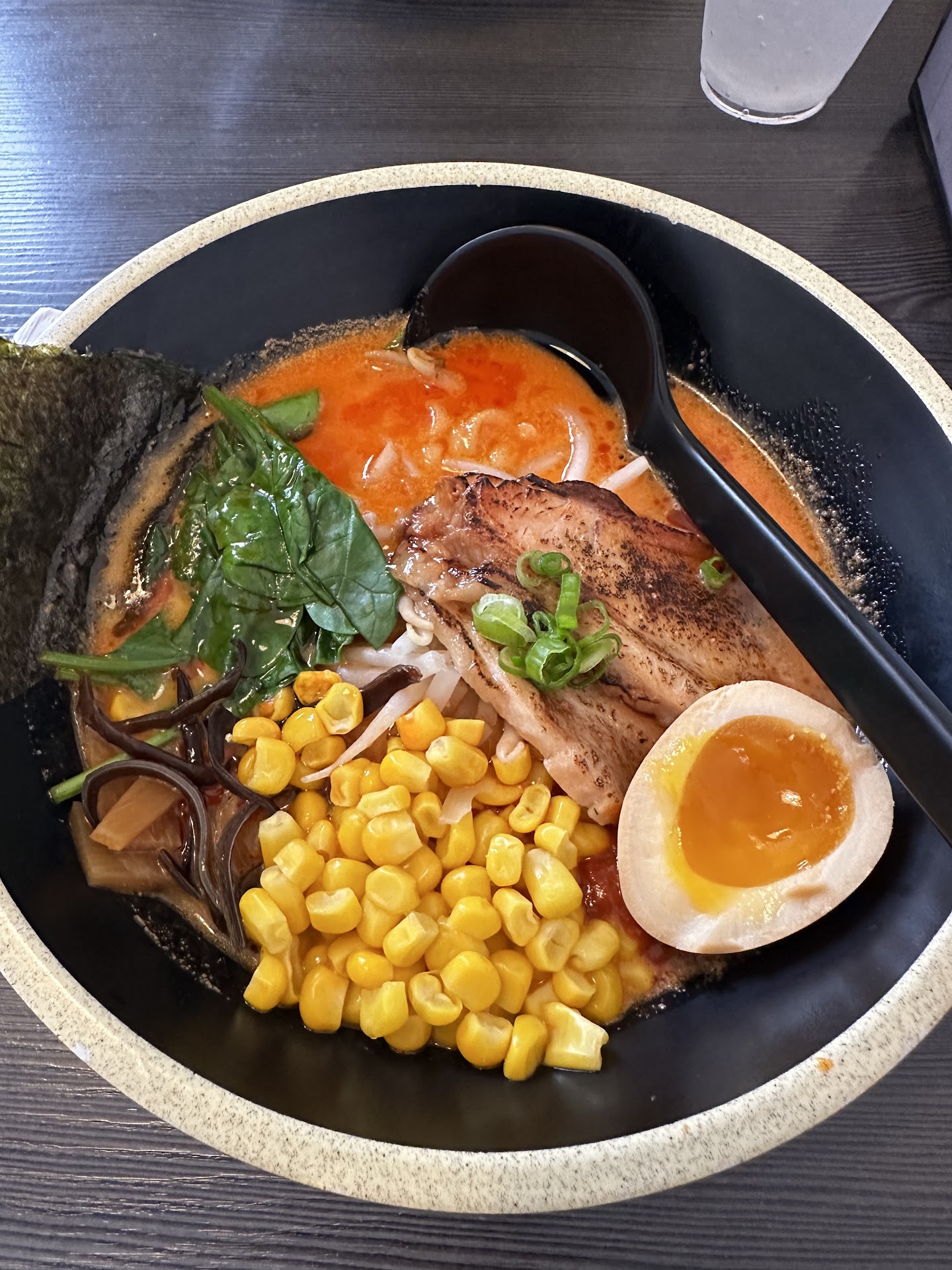 The tonkatsu ramen: the egg was straight up cold, like it was in the fridge and they didn’t bother thawing or heating it through before serving it. Same with the bamboo shoots, cold and slightly undercooked. We could have lived with these minor missteps but unfortunately the star of any tonkatsu ramen, the broth.. was incredibly sweet like someone dumped a large amount of sugar in the broth pot. Very strange and confounding and not good at all. It was so sugary I struggled to eat it. The black garlic ramen also suffered from being overly and strangely sweet. I’ve never had ramen that I would describe as cloyingly sweet until now. I literally have a strange aftertaste that reminds me of that fake diet soda sugar in my mouth an hour after eating there. 5 stars for service, two...