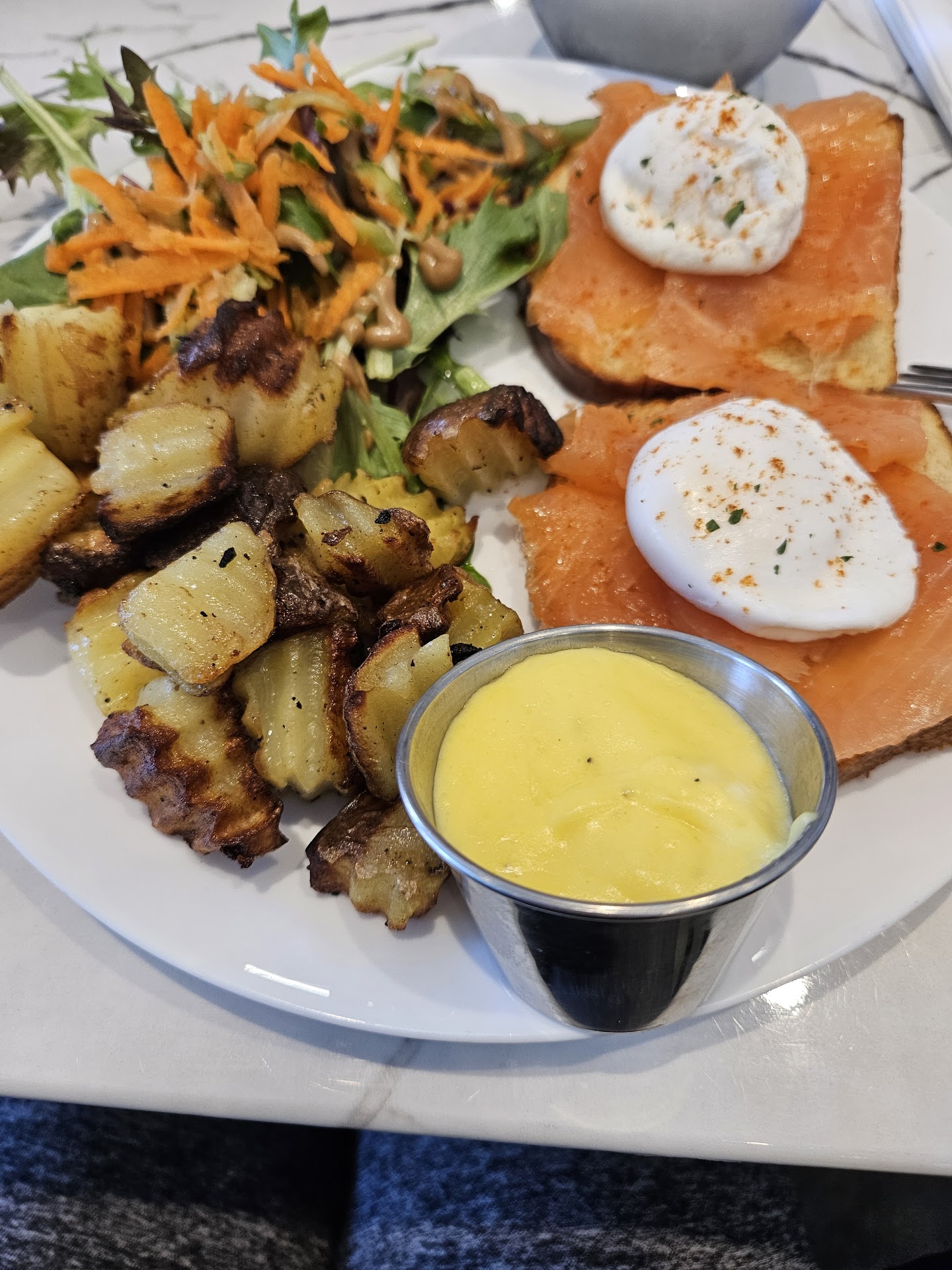 Today we had the Croque Madam and the Quiche Lorraine, which I have eaten plenty of places, and these were the best I've ever had. The Croque Madam was light and flakey, comforting, and satisfying. The Quiche was custardy and perfectly portioned filling, with a flakey croissant-style crust that surprised me by being even better than traditional pastry crust. The side of potatoes were crispy on the outside and tender on the inside. The mixed greens salad was fresh and the dressing was balanced. The espresso was dark, low in acidity, with notes of cocoa. Cappuccino with oat milk was perfectly foamy and generously portioned. The chocolate eclair was filled with a light chocolate custard and the outside was the right texture--not soggy at all like some places. The fruit tarts and other desserts are gorgeous and so flavorful with fresh fruit and fillings.