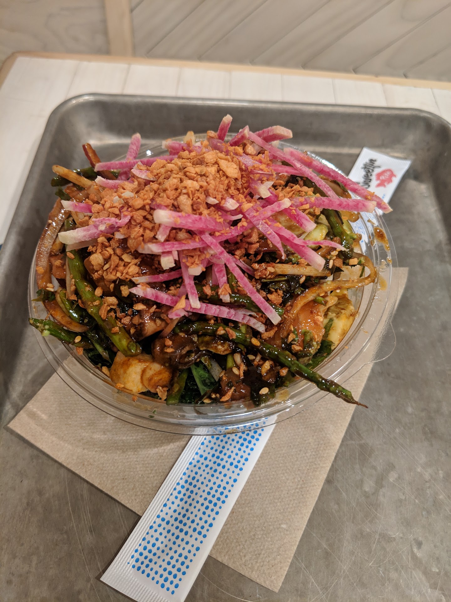 My bowl is barely full. I ordered a small but this looks like a kids portion. Barely any protein, rice or kelp noodles slaw. What's worse is the lack of flavor. Gochujang is supposed to be spicy and sweet. But all I taste is bland veggies and sesame seeds.