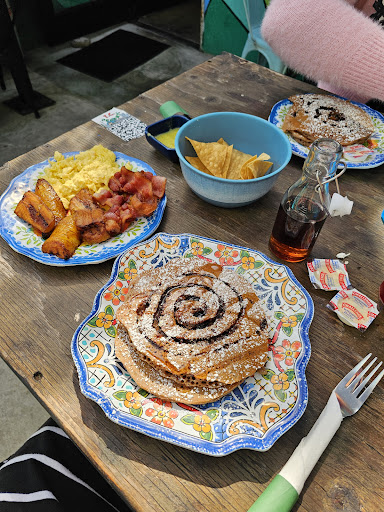 Read moreDiscovered this gem of a place when looking for a cute breakfast spot while staying nearby. We were immediately welcomed when we walked in and they were so nice! We had our pick of seats at 9am on a Sunday and sat in the back courtyard, but when we left a little after 10am it was busier, seems like a local hotspot. They started us off with complimentary chips and salsa while we browsed the menu. Everything was delicious, service was great, and atmosphere was amazing. I will definitely return next time I'm in the area! I highly recommend the vampiro juice, cinnamon roll pancakes and plantains! I ate the pancake combo for breakfast substituting the potatoes with plantains and it was great, wish I could've finished it, but it was...