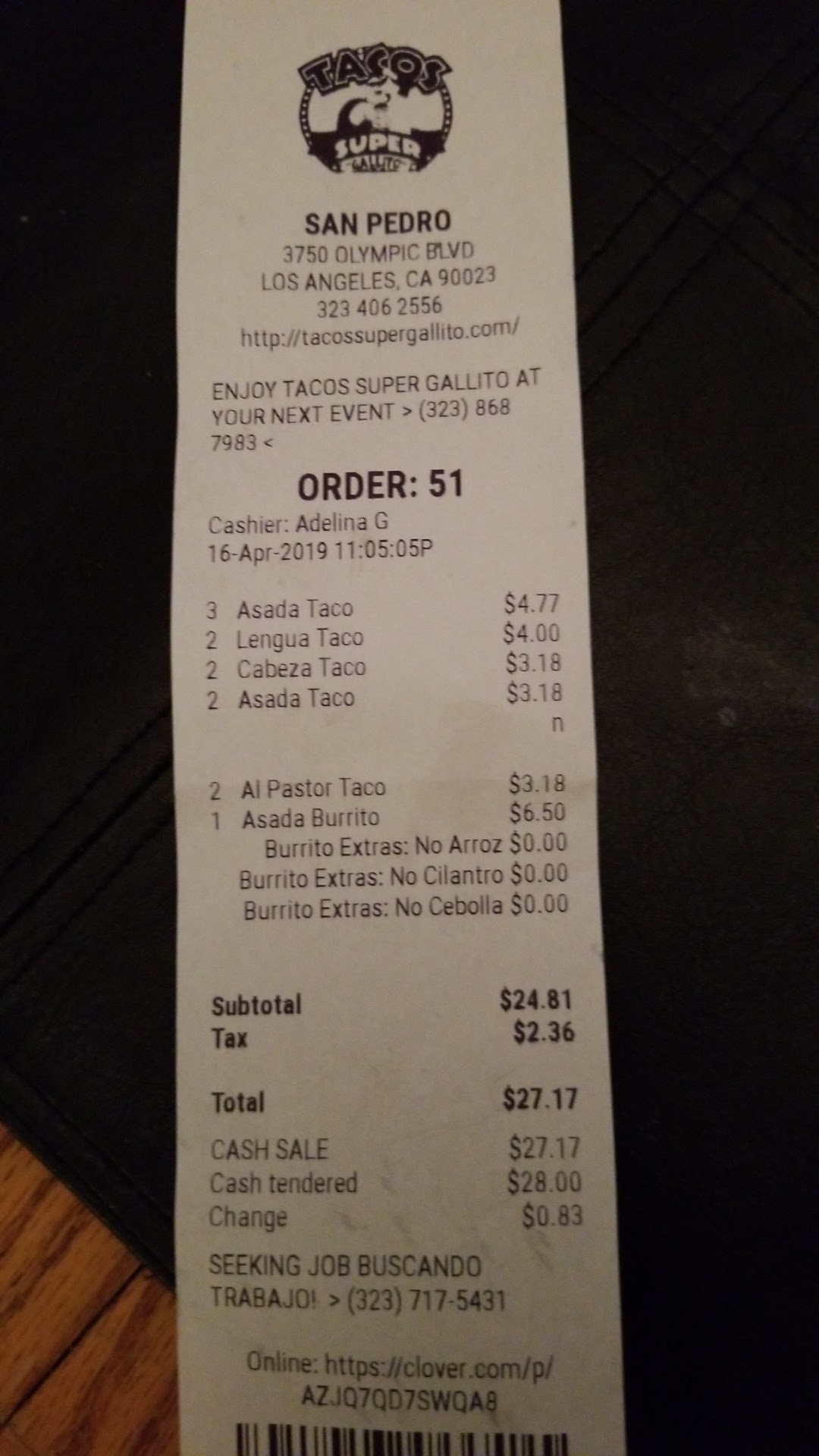 The taco al pastor was ok, a little dry, very small with barely any meat... that's ok I guess. The asada in the torta was one of the worst meats I've ever had. With every bite I had I was chewing gristle. I could not enjoy the torta because it was all like that, it was terrible. I kept chewing and spitting it.