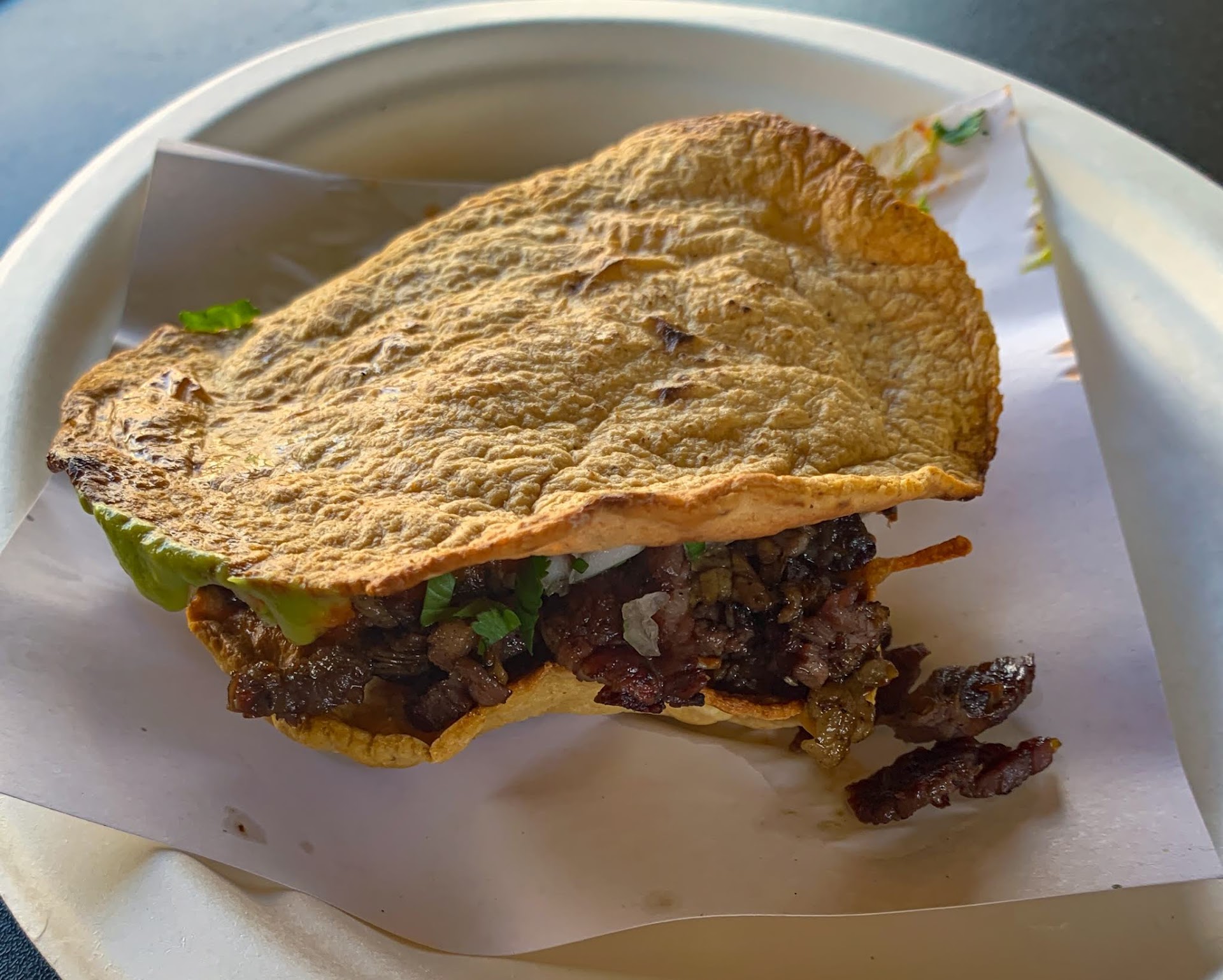 A better option to order is the "Carne Asada Vampiro." A "Vampiro" is a taco made using tortilla shells that have been griddled for a while over low-heat until they are dry and crunchy; the tortillas contract and ruffle a bit during this process, often resembling a "vampire bat wing," hence the name. Some taquerias serve their vampiros as one tortilla topped with melted white cheese and the toppings, while other places, including Tacos 1986, use two corn tortillas to make a "sandwich," similar to a mulita, stuffed with the toppings and melted cheese.