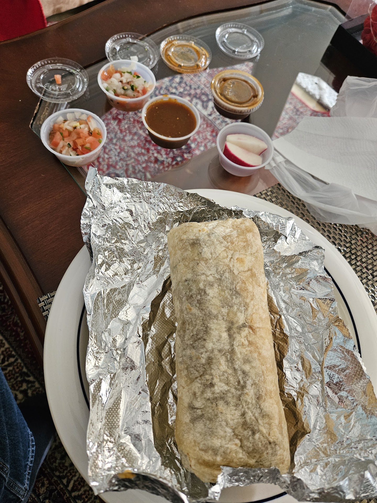 Read moreSince I was in the area, I was in the mood to try a new place. I wasn't familiar with this place but I was with the plaza this taco place is in so I parked and looked at their menu. I decided I would try out their burrito so since I came in the morning, I was able to find parking. Finding parking in this plaza will be the hardest part coming here if you come after lunch time. I first thought they weren't open since I didn't see the open sign but when I got closer to the store, I saw the lights were on. When I walked in, I saw that they will charge an extra free if you pay by credit card so be aware of this. I put in the order of a carne asada burrito and asked for no beans. I also asked what else was in it and she just told me rice, meat, cilantro and salsa. I went to their salsa bar to get some extra salsa and pico de Gallo. I like that their salad bar is in a refrigerated area so it stays nice and cool. My burrito didn't take long to make like 5 minutes and I took it to go. I think they give you a decent size burrito and a good portion of carne asada. I thought some of the carne asada was overcooked so it was hard to chew and didn't have much taste. Their red sauce was okay but it's not my favorite, I felt the same about the pico de Gallo. So my burrito was okay but I wouldn't likely get it again if I was...