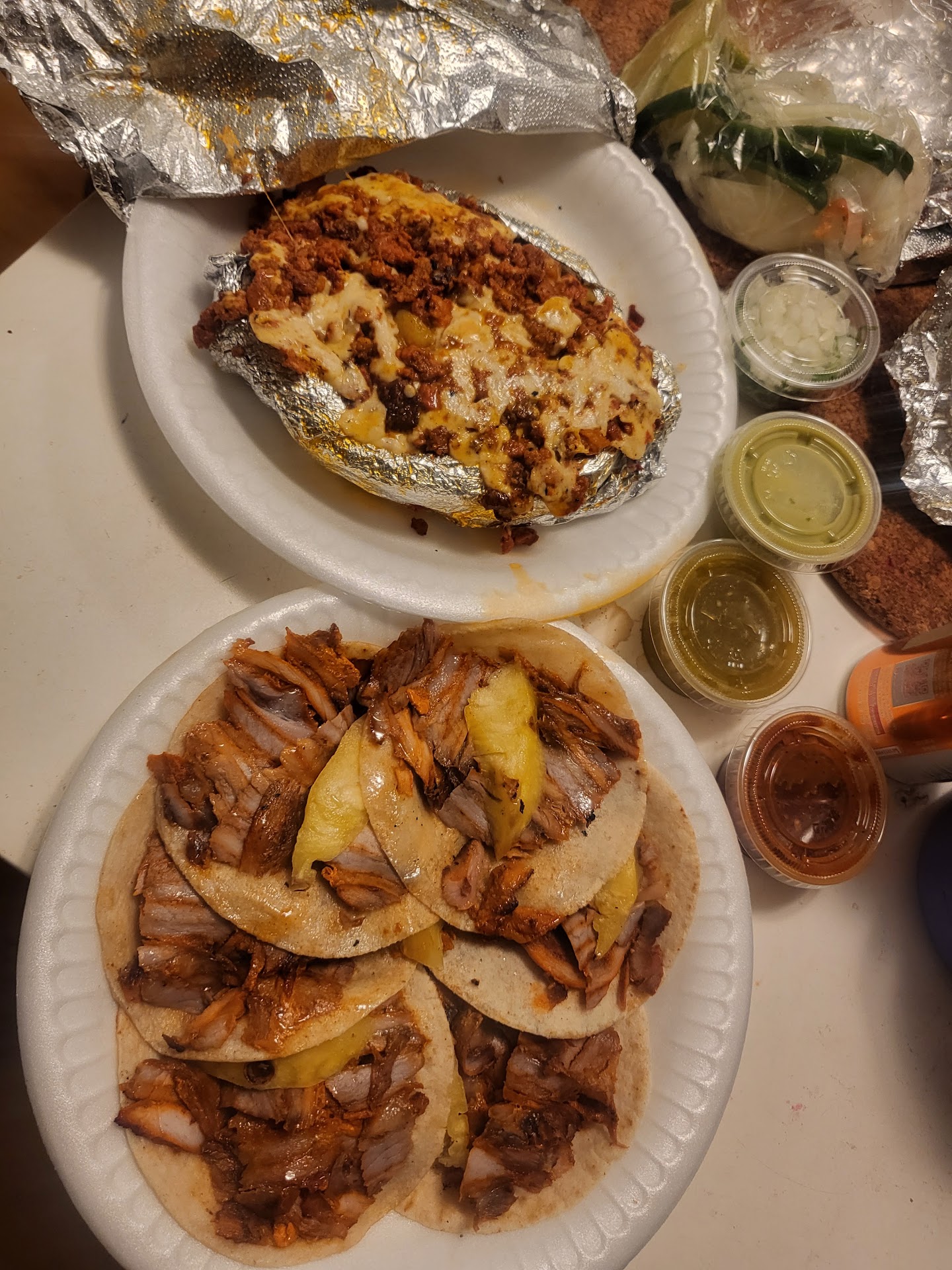 Great street style tacos. Three people speedily make your order. They take cash/zelle. They can even take your order over the phone for pickup. They start setting up around 4ish and stay till about midnight. The tortillas for the tacos are flour and are freshly made before they grill them. They have a good selection of meets. Pastor, asada, chorizo, pollo, cabeza, buche, and lengua. My fav has to be the pastor + lengua. While you wait, you can fill up on the salsas. They have super picante, chili verde, and the mint salsa. Street tacos are small so for an average person, I would at least order 2 at a minimum. I also tried their quesadilla con asada, and it was pretty filling though a bit pricey. Overall a good spot to get street tacos. And good for that late...