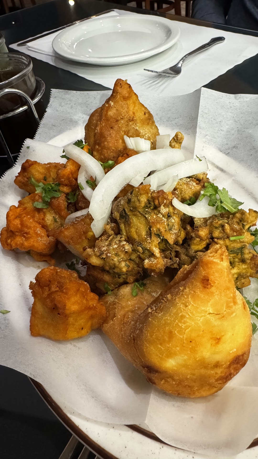 We came around 5:30p on a Saturday so the restaurant was entirely empty (when we left at 6:45 it was packed). We were greeted by friendly staff who made some good recommendations on the appetizers and the combo dishes. We decided to go with the appetizer assortment that came with different samosas (one with veggie one with lamb), chicken and some other fried veggie. Thru are all delicious and opened up our appetite for the entree.
