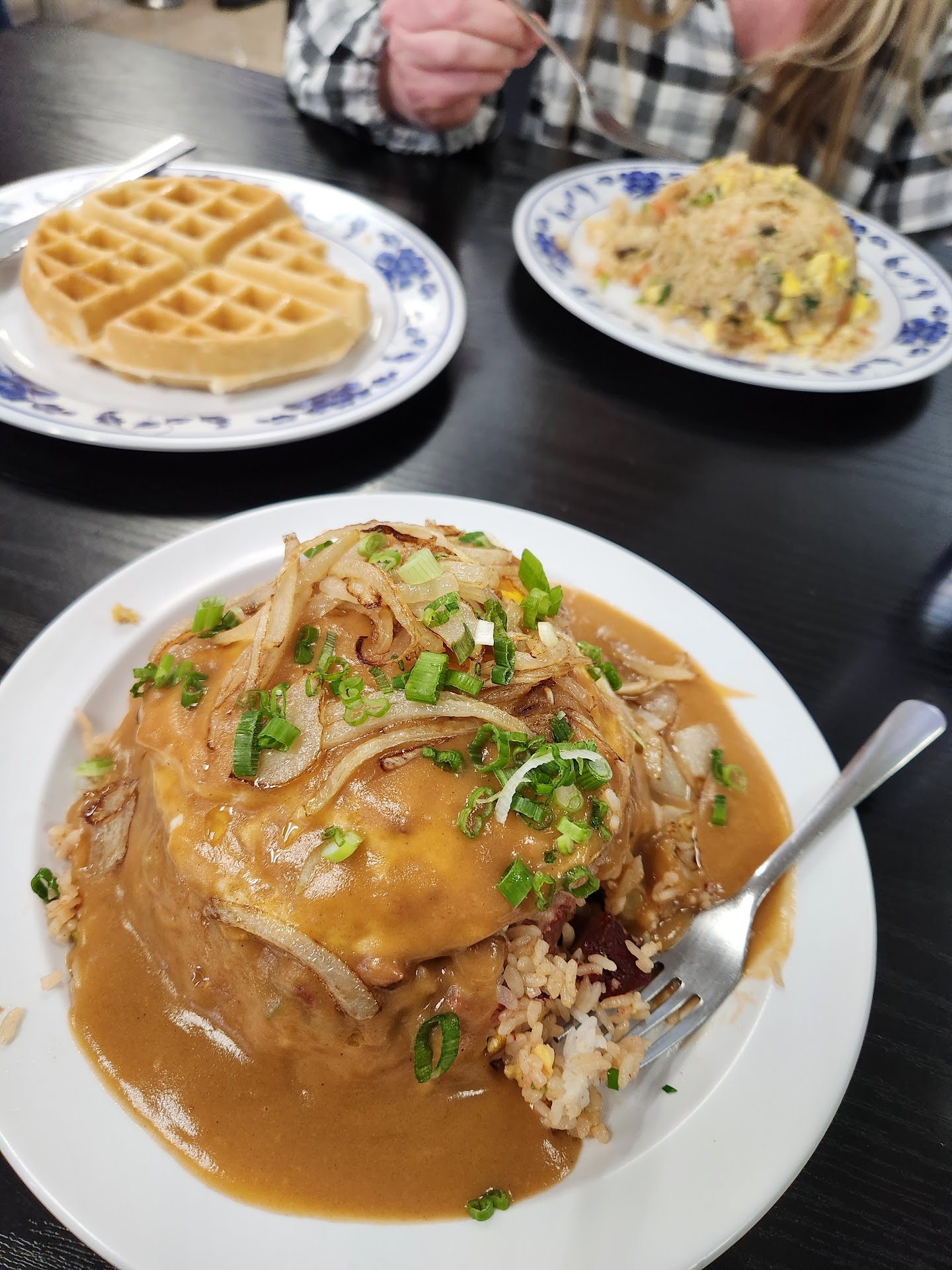 I usually get my food to go. The coffee is very good and always served with a smile. I usually get the Loco Moco. It is a ground beef pattie,served over rice with gravy and eggs on top. Grilled onions to.... Very good and hearty. You get a nice portion, enough for two days or 2 people.