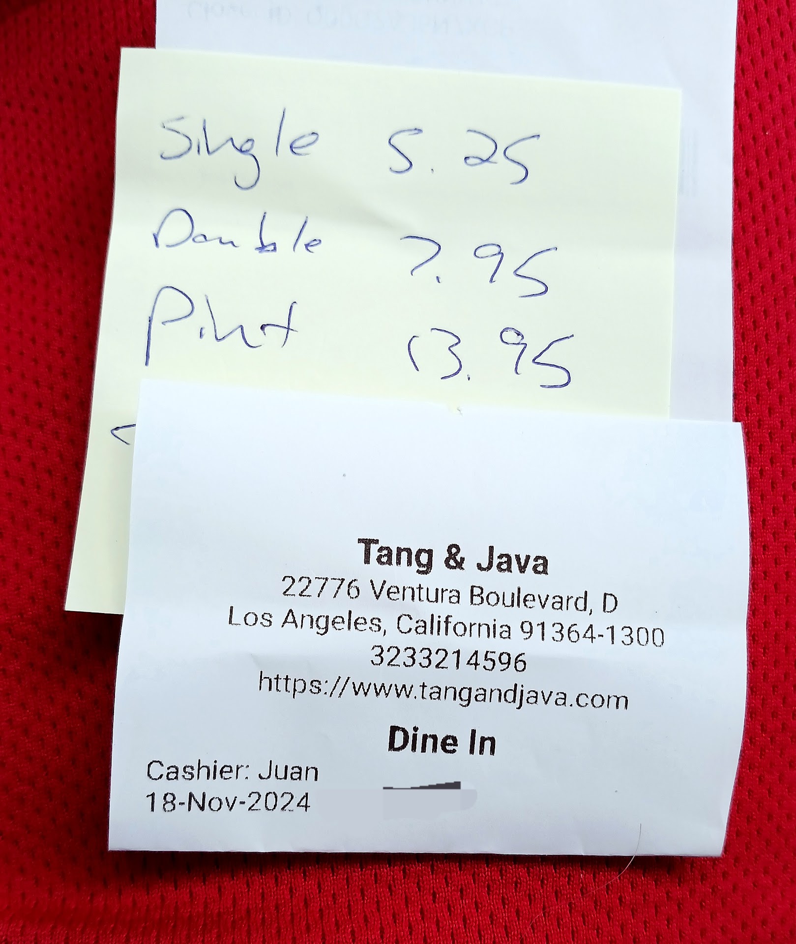 Parking: pretty easy to find parking in the lot, also on the street. Just beware of that light on Fallbrook and ventura. Sometimes you can get stuck there for an eternity. But that's not the fault of Tang and Java. I blame the city of Los angeles. Lol.