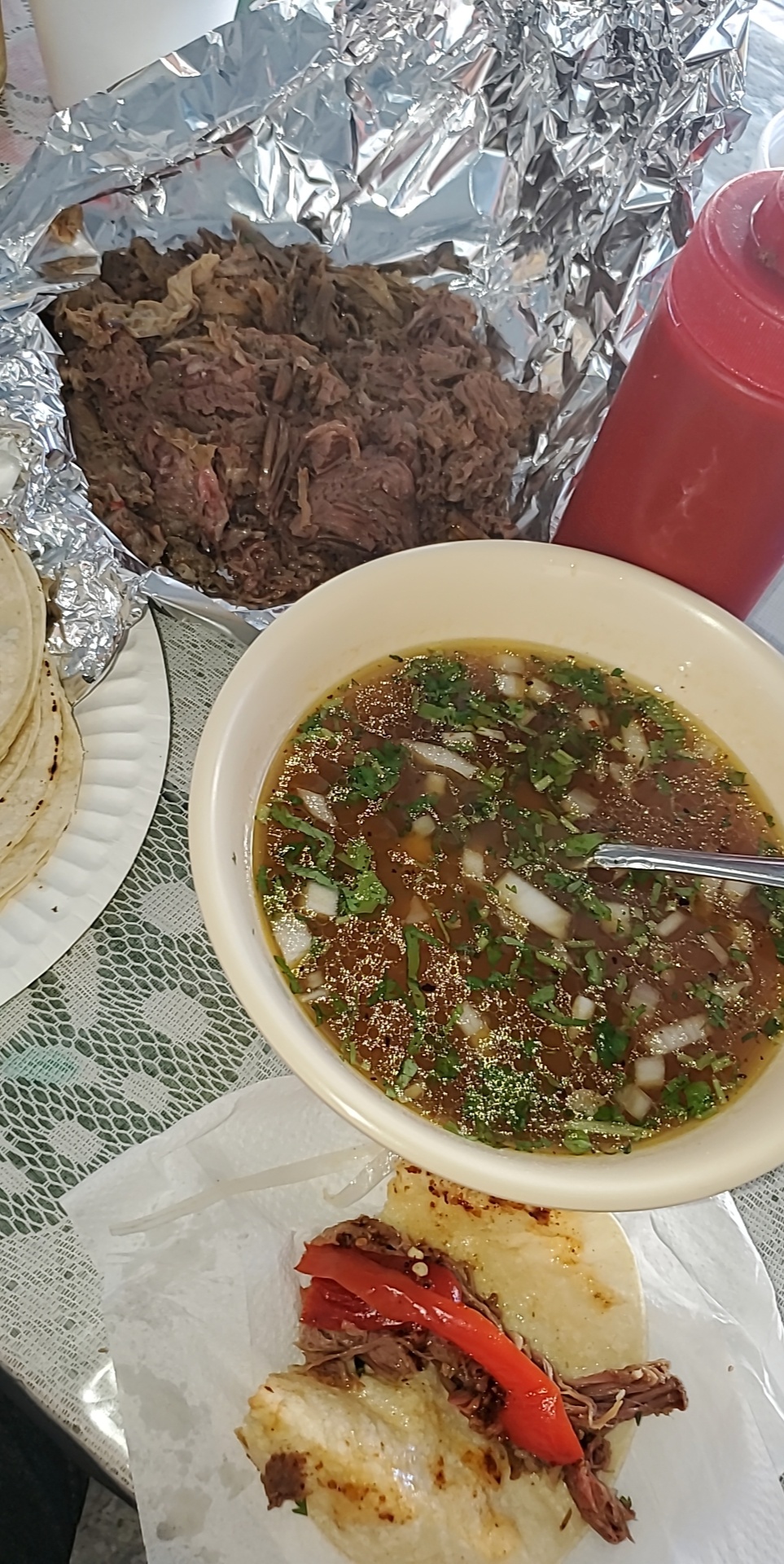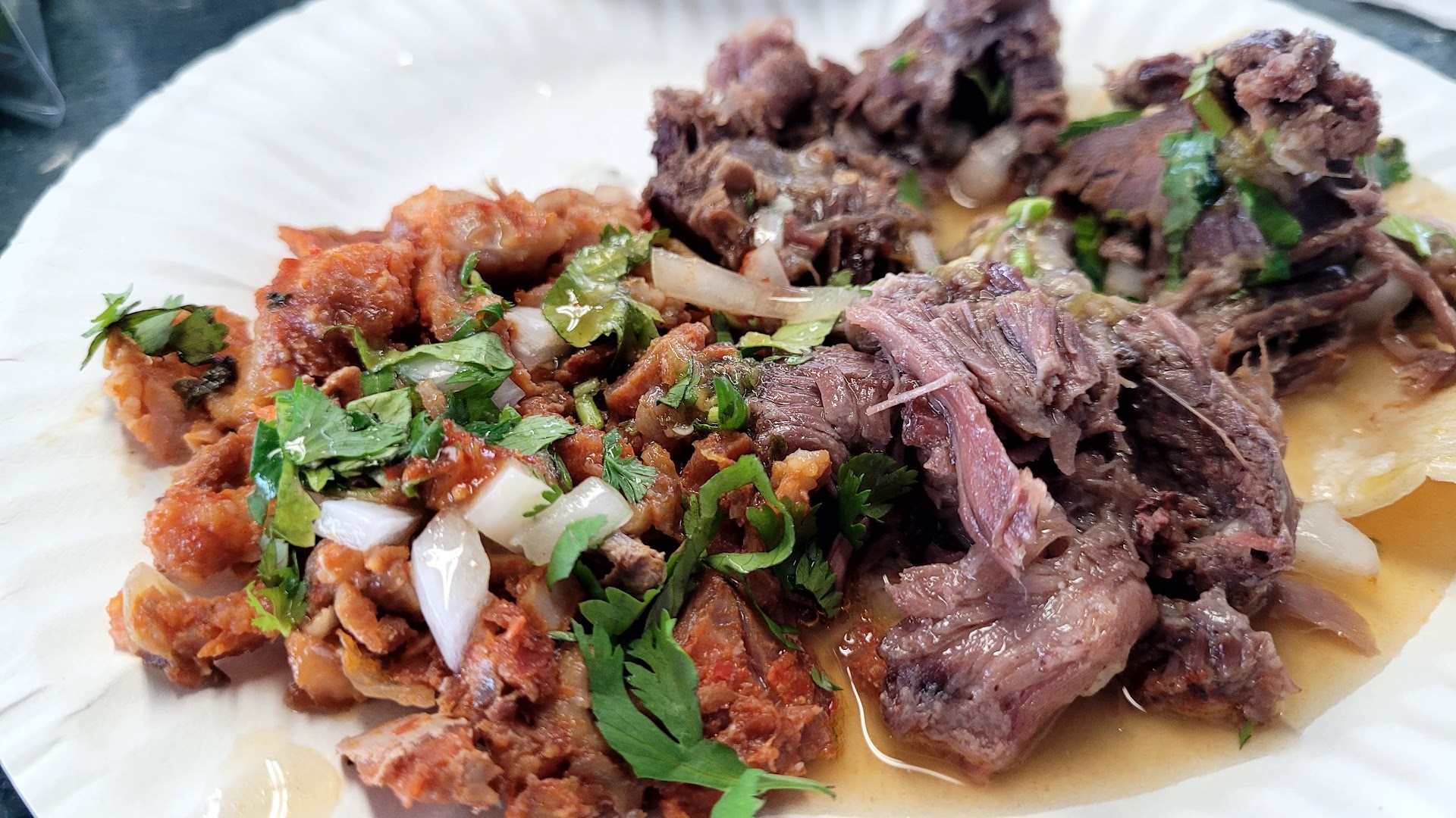 Estado-de-Mexico-style Barbacoa. A very simple and humble establishment but the food is delicious. The flavor is as authentic as it gets. They sell tacos as well as half pounds and pounds of meat. The food comes with all the condiments (onion, cilantro, peppers, etc.) separate (in plastic bags). I am pretty sure it's CASH ONLY. They also sell consome (meat's broth), aguas frescas, orange juice and flans. There are several long tables with benches to sit on. Their parking area is small but fits about 3 or 4 cars parked in parallel. Everything we ordered was really good. Do not expect a restaurant. However, the taste of the food is pretty authentic and delicious. IF YOU DON'T KNOW HOW TO PREPARE YOUR PLATE after they bring you your food: You basically place some of the meat in a plate/tortilla, squeeze some lime juice in it, add some chopped onion and cilantro and add as much salsa as you'd like. Last, add a little bit of consome to your mix and violá, you got an authentically-prepared Mexican Barbacoa plate/taco! Take a look at some of my pics. I am coming back to this place!