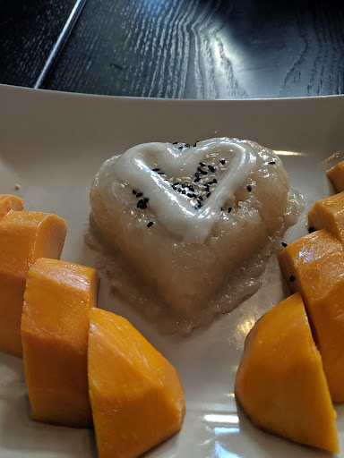Finally, mango and sticky rice--I don't think I have to say much about this dish since one can't really mess this up unless one of the ingredients is just completely messed up in some way. The traditional Thai dessert came in a heart shape and the overall presentation is super nice, too--simple but nice! I think they could have provided w/ more mango considering they charge a pretty penny for it.