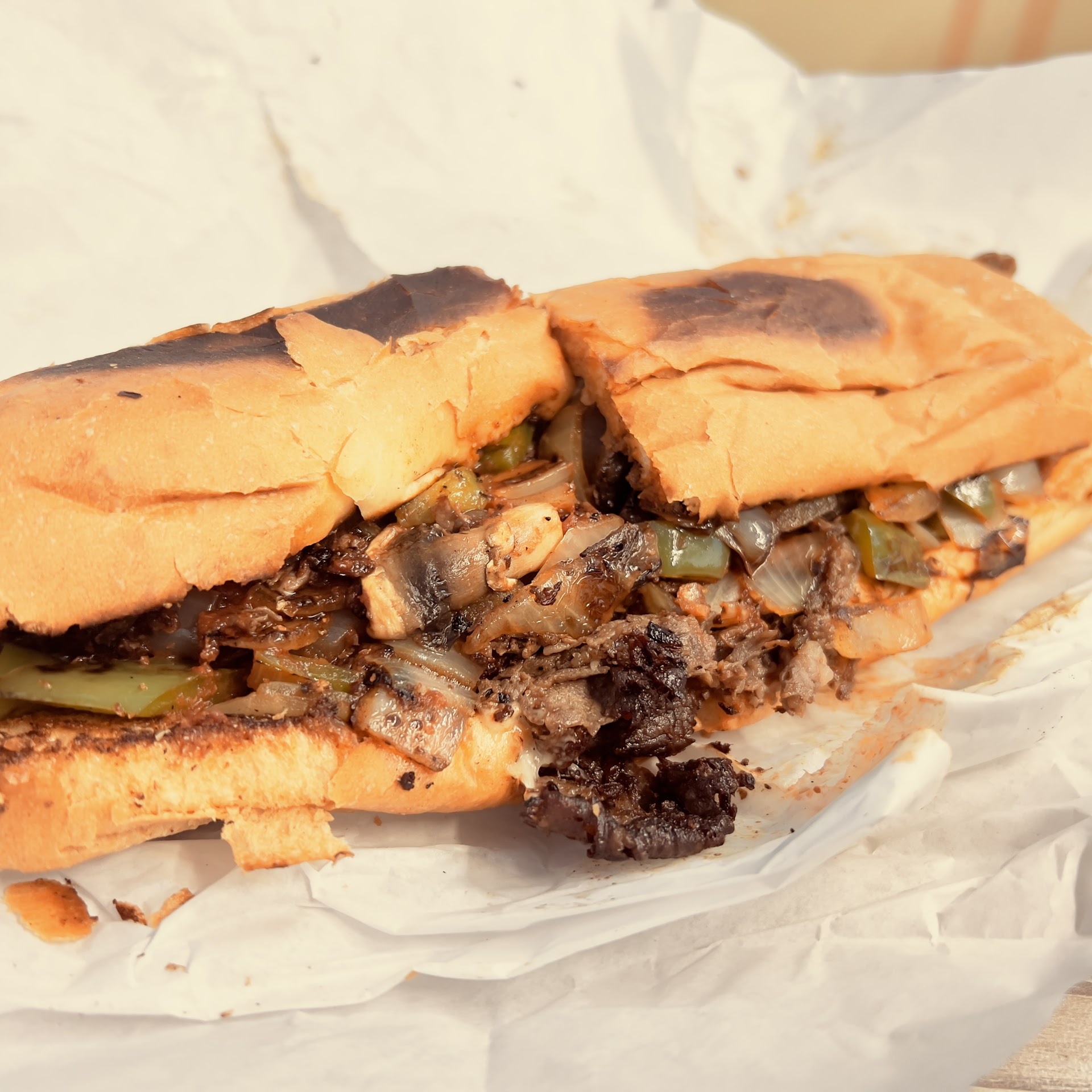 The sandwiches are pretty good. It's not a real Philly style cheese stake, but good none the less. The meet is thin, but not too thing, (it is sometimes a little grisly, but usually not so much). The bread is really good, the cheese is nice and provolone gooy, but I di not dig the tomato sause on the sandwich. If that's your thing, then there you have it, but not for me. The parking lot is miniscule but free.