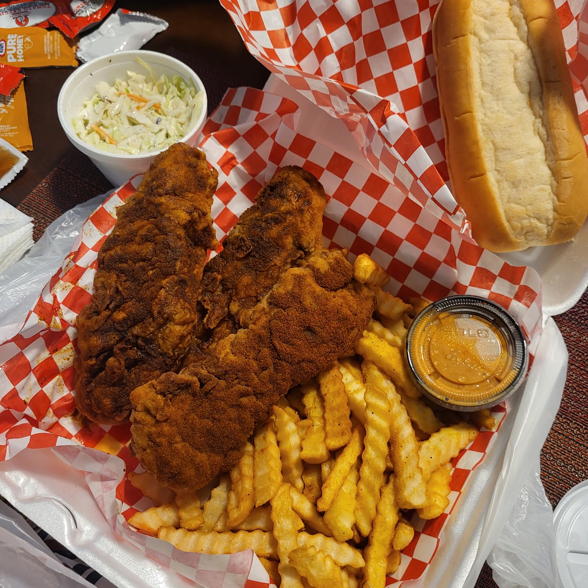 Huge tenders! I ordered the five tenders w slaw and fries combo. The tenders are huge and juicy! If you want quantity, this is the place.