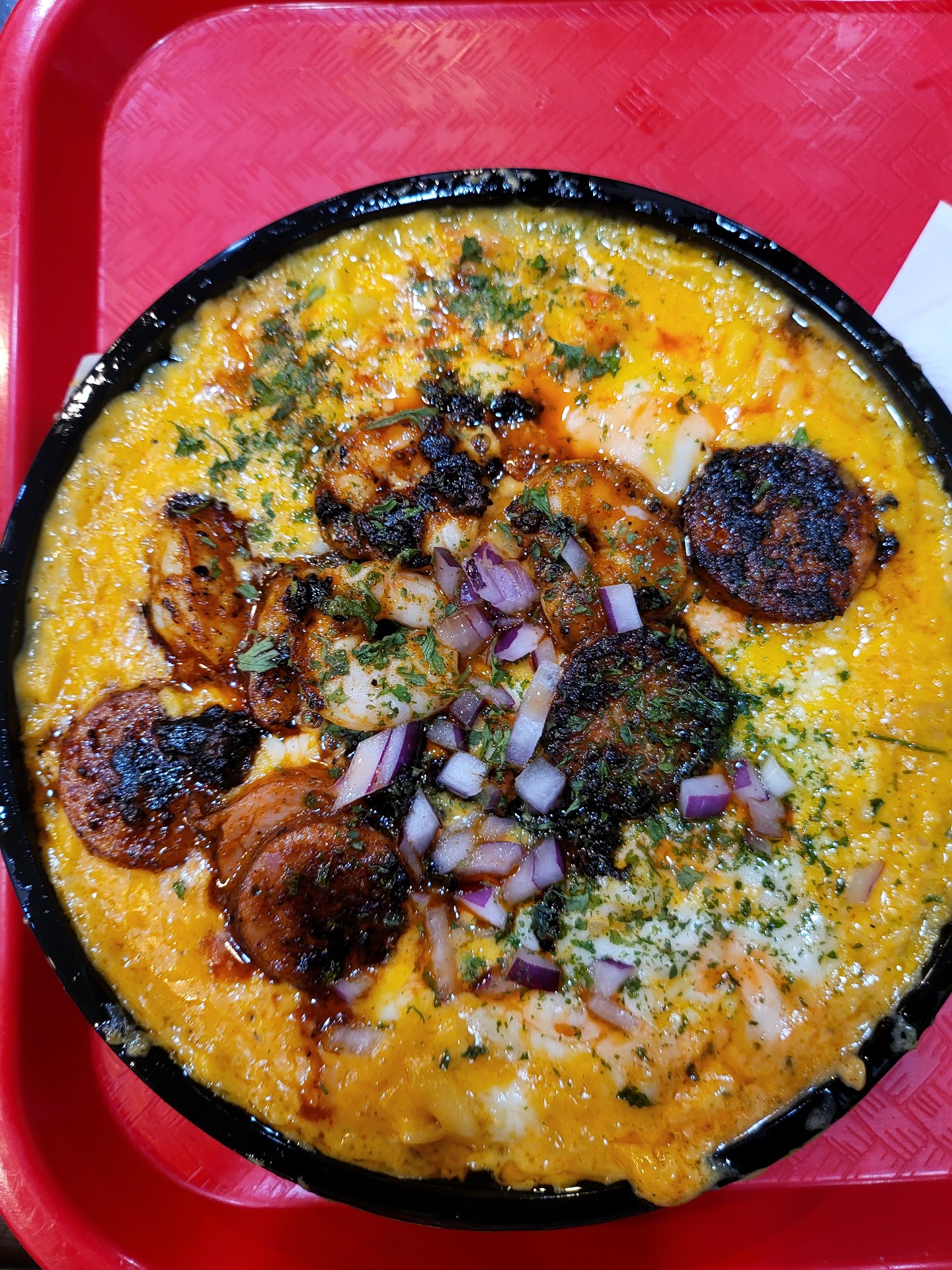 I ordered the crawfish mac and cheese deluxe. This dish could have been so much better! I'll start by saying that Creole cooking doesn't equal cayenne pepper and hot sauce alone and this one had way too much. What is does mean is seasoning and taste. The taste and seasoning was overwhelmed and overpowered. The temperature of the dish was nice and hot and presented well. First bite the cayenne jumped on me! But, I could tell that it was seasoned well and would taste good. I was profusely sweating as I ate the next few bites. I had to go to the bathroom for extra napkins twice! Throughout my eating I'm getting bites of raw onions. White onions were throughout and it was garnished with purple onions on top. Way too much. So much so that my urine the next day smells of onions! Come on!