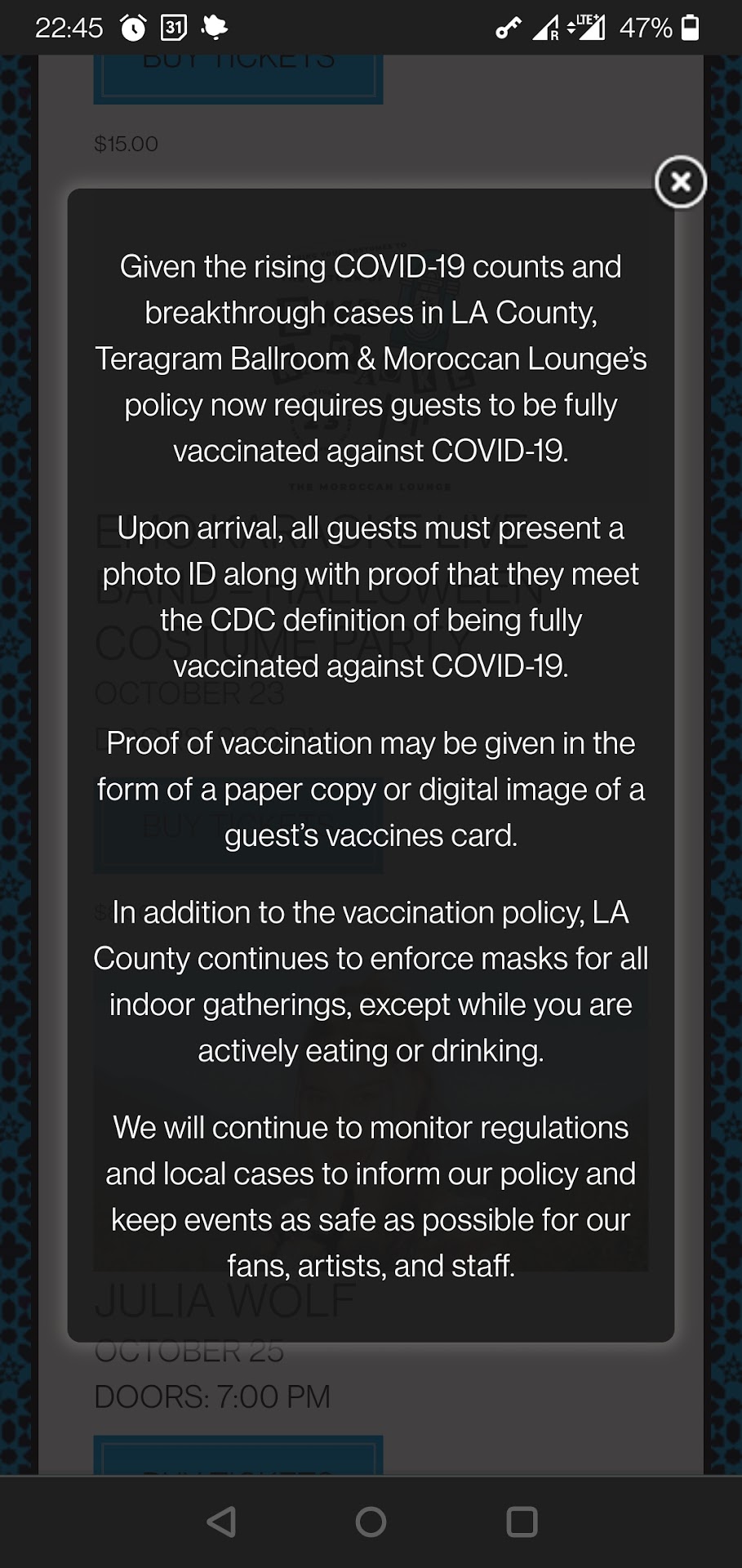 Typically, I secure concert tickets several months prior to the event. However, as I reside in Michigan, I could only get tickets to the concert once I knew I would be in Los Angeles, which was approximately two weeks before the scheduled date. Upon receiving the tickets, I immediately noticed that the event had been rescheduled, and the venue had been changed from The Teragram Ballroom. Additionally, while the original venue had listed the door time as 6:30 pm, the Ticketmaster event page conveyed the door time as 8:00 pm, and the tickets themselves stated a door time of 6:00 pm. To obtain clarification, I contacted the information email addresses on both the original and the new venue's websites on April 16, 2024. However, I did not receive any response. Consequently, on April 19, 2024, I sent another email and attempted to place a call. On calling the phone numbers provided on the venue websites and Google, I received a reorder tone for one, and for the other, I was routed right to a voicemail box with an ordinary recording that did not indicate it belonged to the venue.