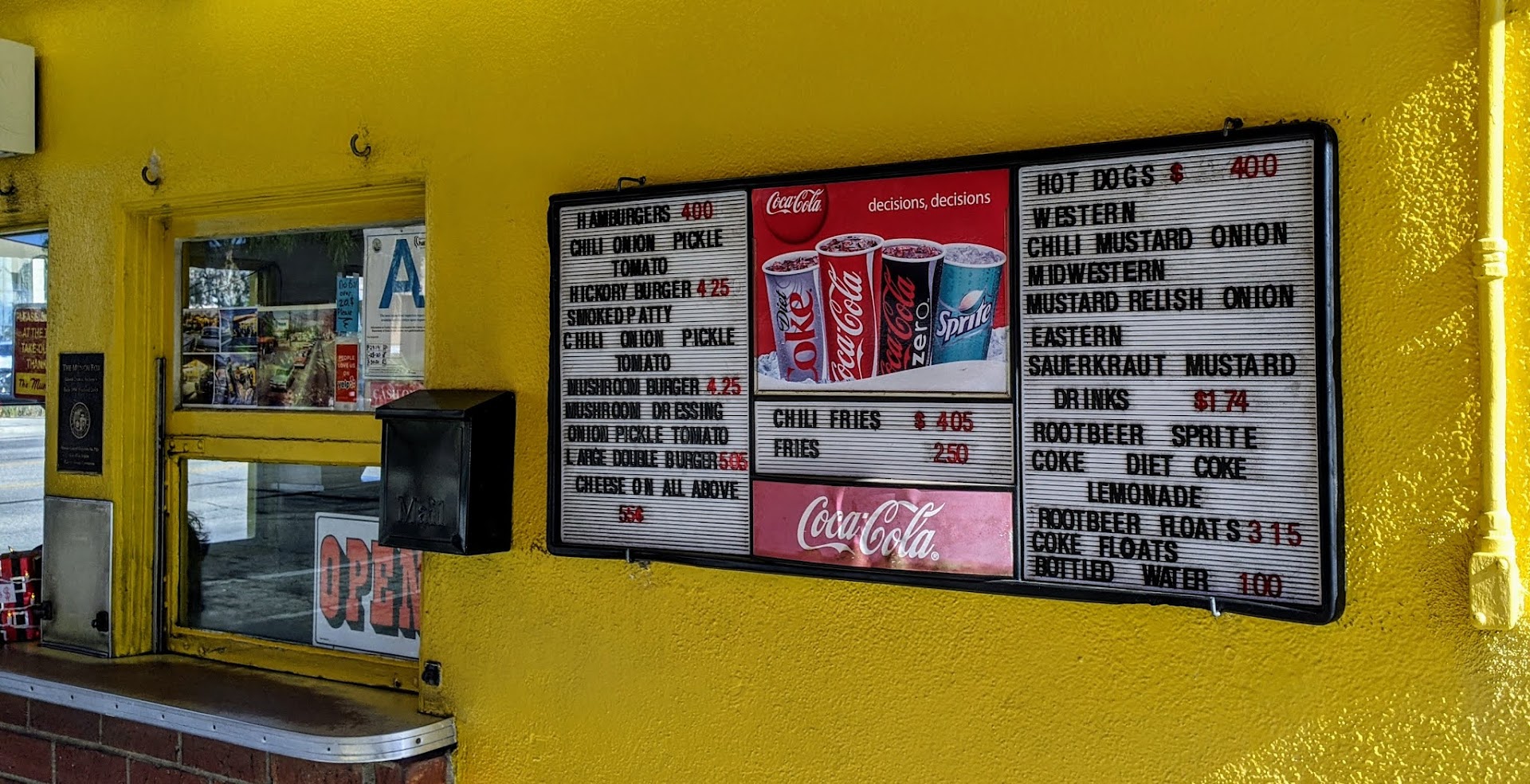 The food is the best. We love their chili dogs with raw onion. Their burgers with chili are great. I don't care for American Cheese, not really cheese now is it, and that is all they have, but my grandson loves it. They still sell root beer and even though it is the same you can get at a grocery, it seems better there.