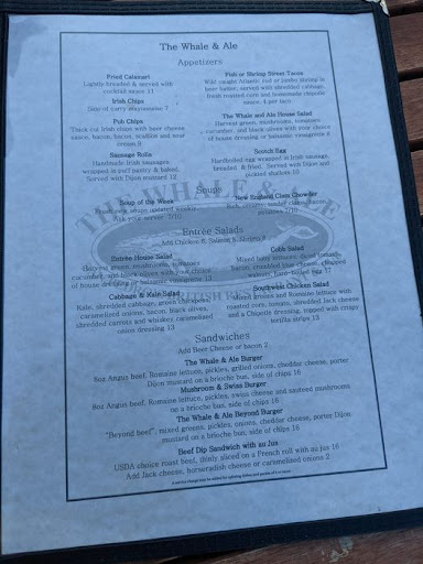 The Whale and Ale Irish Pub is an absolute gem. The atmosphere is warm and inviting, with a perfect blend of traditional Irish decor and modern touches. The staff is friendly and attentive, always willing to go the extra mile to make sure you have a great experience. The food is top-notch, with a menu that features both traditional Irish fare and contemporary dishes, all made with the freshest ingredients. The beer selection is impressive, with a wide range of options to suit any taste. I highly recommend the Whale and Ale Irish Pub for anyone looking for a great night out, whether it's for a casual meal or a special occasion.