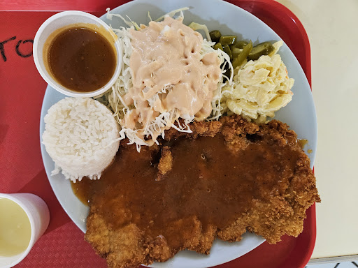 I ordered the fried fish plate, which came with a few pieces of fish, rice, macaroni salad, and cabbage salad with thousand island. Since you can't go wrong with rice and cabbage, my grief is with the other items on the plate.