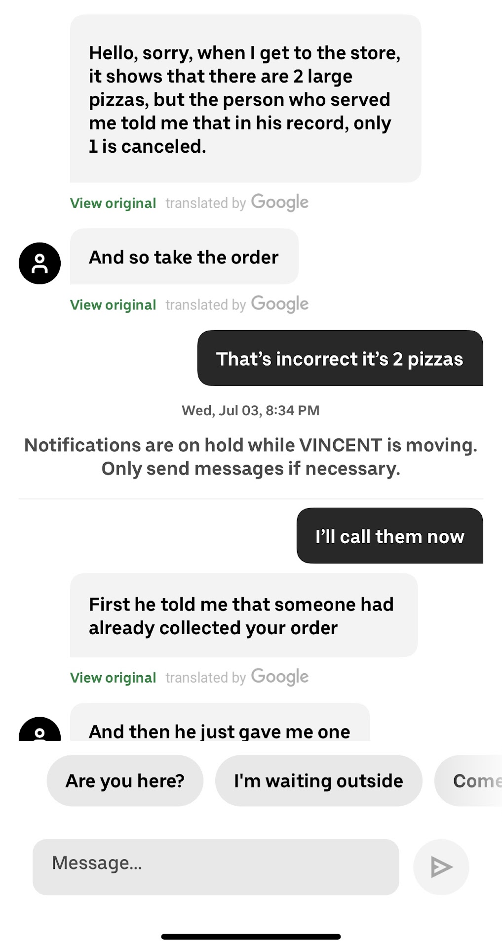 Ā Ā Ā Read moreIāve had terrible experiences with this location when it comes to UberEats. They allowed someone to take my food and between them and the delivery driver someone lied. The delivery driver said my order was cancelled and only 1 pizza was given when it should have been 2. After calling the store and speaking with a gentleman he said someone came in and got my order and left because my delivery driver got there. Iāve attached my conversation...