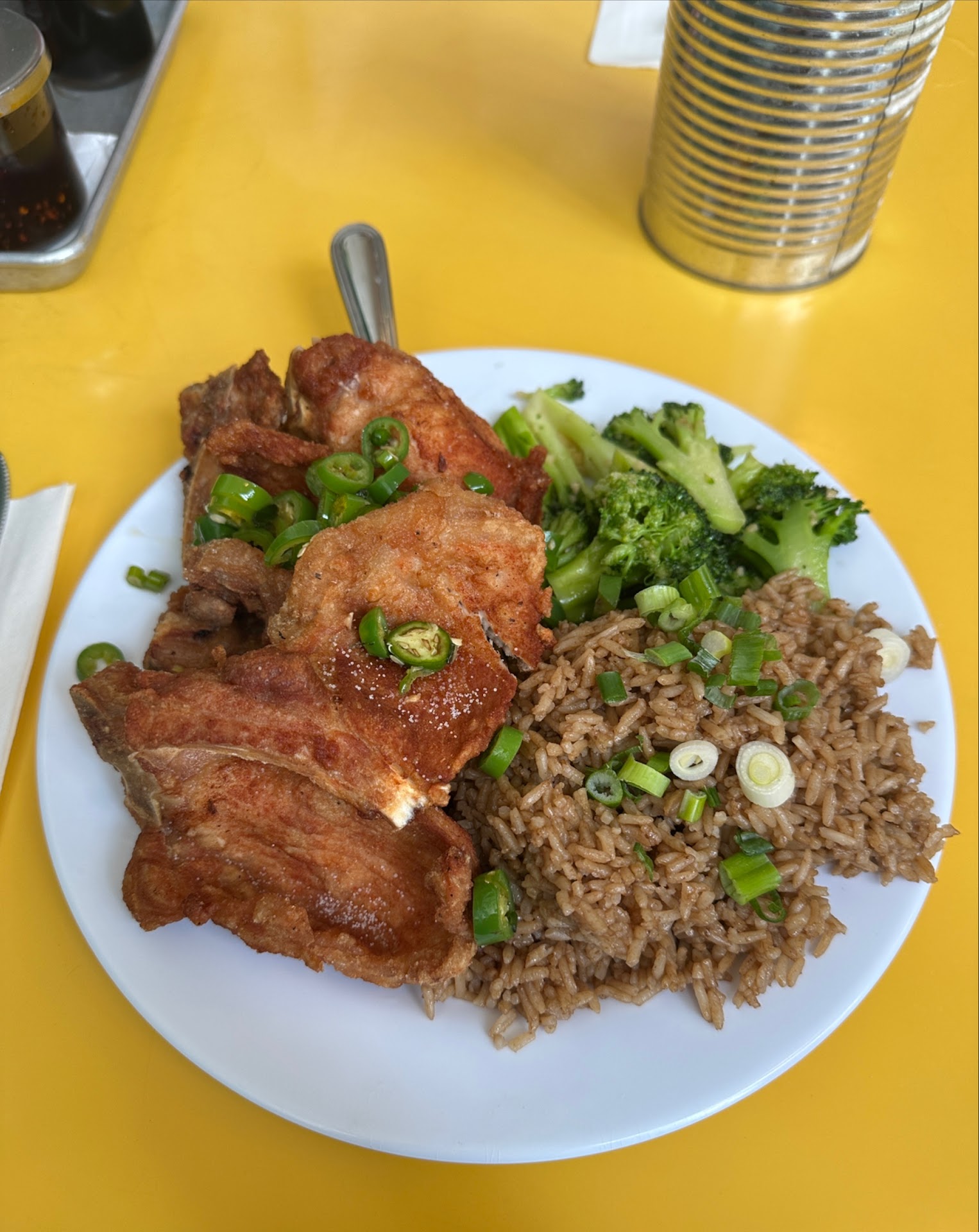 I’ve eaten here twice, the first time I had the “famous” Spicy Pork Chops which were perfectly fried to a crisp and complimented with soy marinated Jalapeños (it’s a beautiful combination). This came with fried rice (that was literally just white rice fried in soy sauce) and garlic broccoli. The simplicity somehow makes it taste that much better.