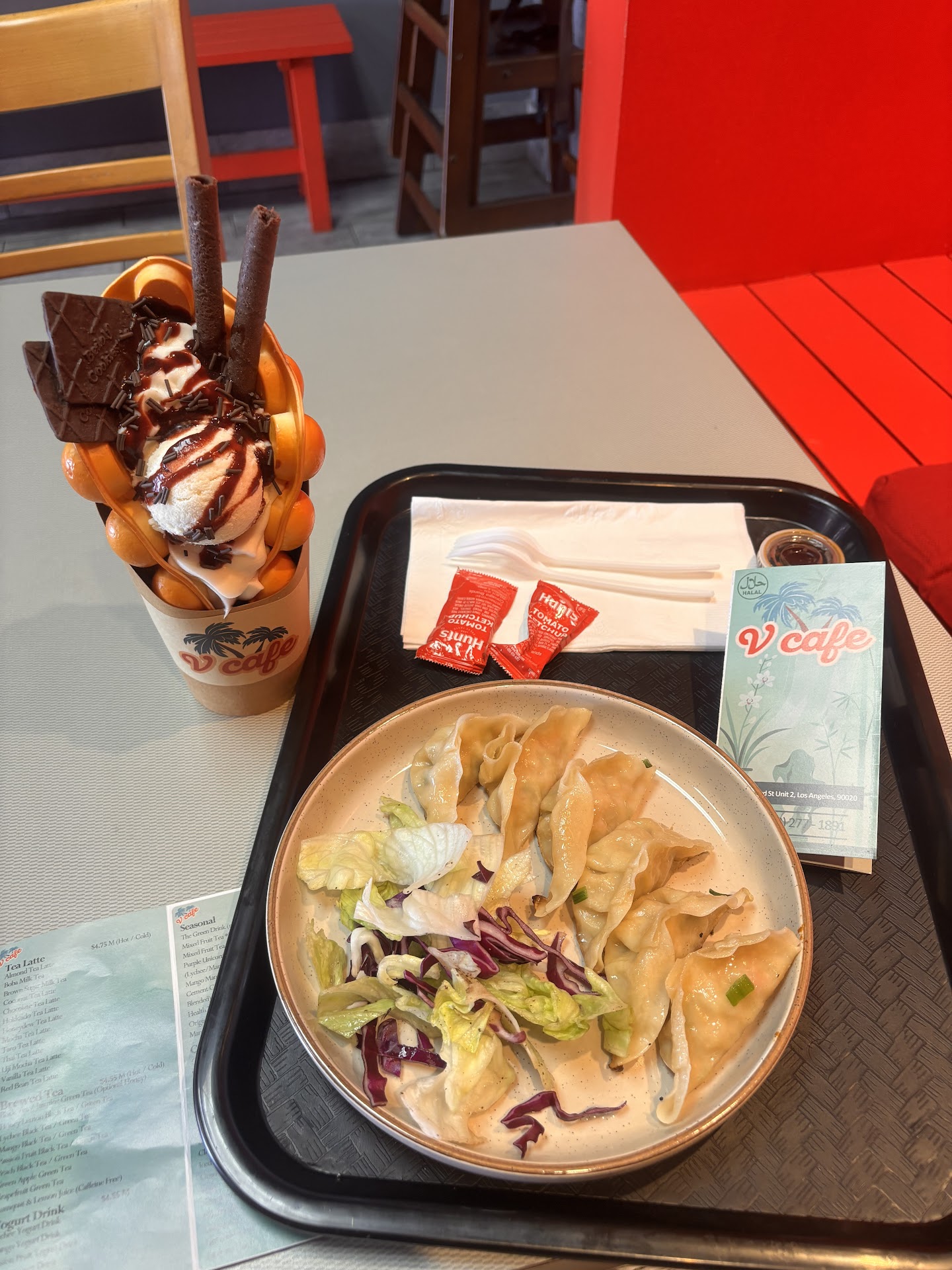🍽️ Food: I ordered a plate of steamed dumplings that were absolutely flavorful and perfectly cooked. Each bite was tender and packed with a savory filling. The side of fresh lettuce and purple cabbage added a nice crunchy contrast. To top it off, I indulged in their signature bubble waffle ice cream sundae—a beautiful treat with scoops of creamy ice cream, chocolate drizzle, chocolate wafers, and crunchy toppings. It was both visually stunning and mouthwateringly good.
