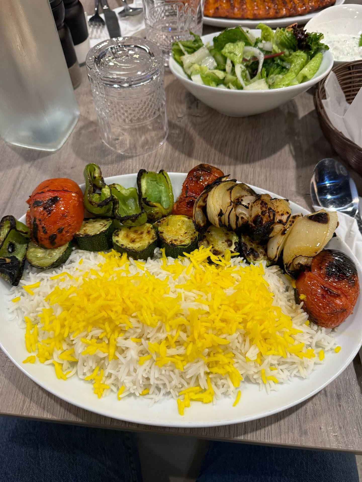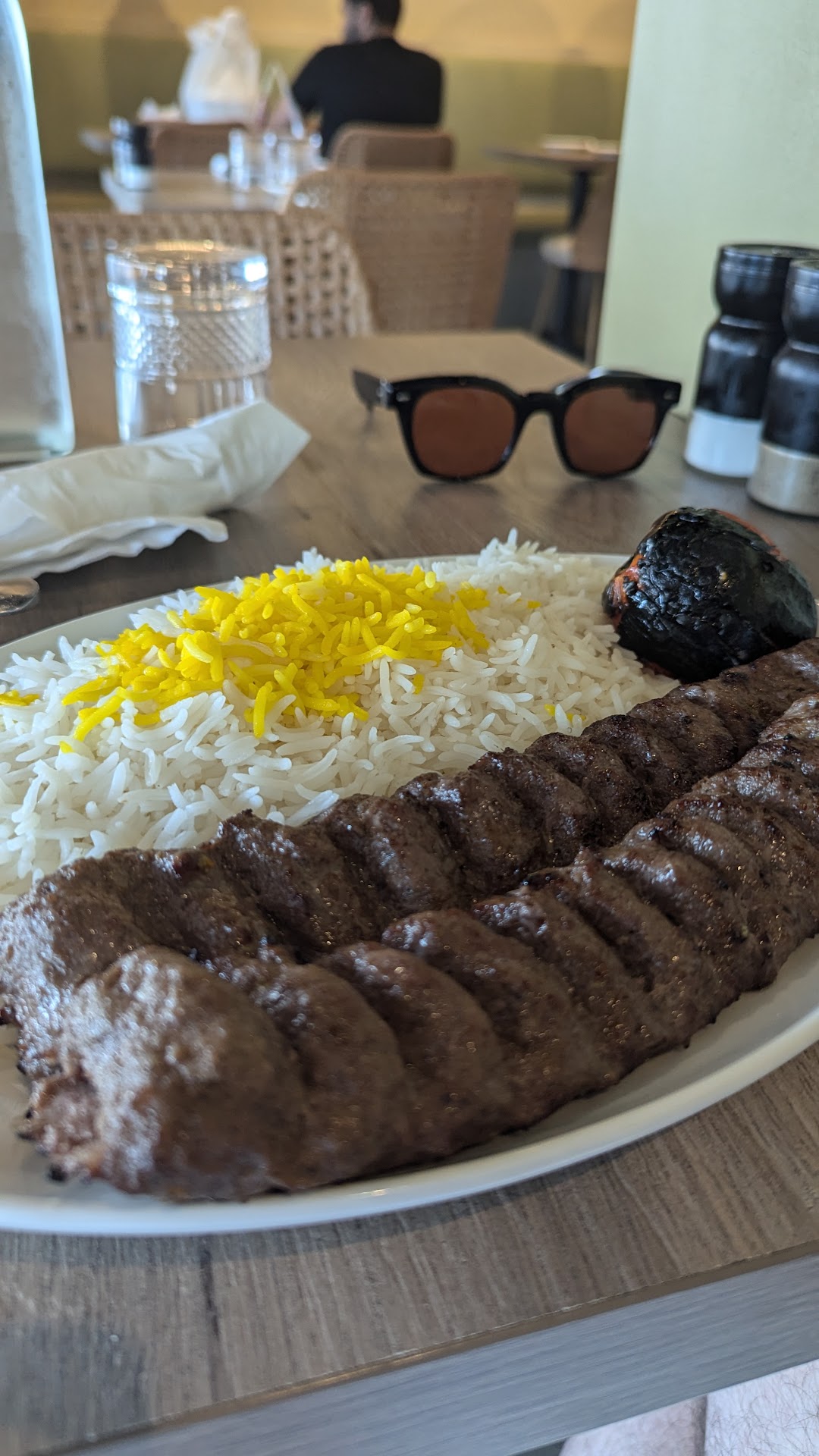 We were hesitant to eat at this place because it is new to us, in these days spending seventy plus dollars to just try something you may not like is not what we wanted to do, and also we had a couple of errands to do before dinner, but when we were passing by, the place smelled so good that we had to stop to take a look at the menu and considered trying it later, then a guy whom I guess was the owner came outside and invited us to come I and try the food, his energy was so welcoming that we went in and sat at a table, the place is beautiful and the color palette is relaxing. Then we decided to order to go, but we wanted go do our errands and pick up the food later, we asked our waitress who was so kind and accommodating that I can’t believe you can get that kind of service in Hollywood anymore. Later at exactly the time we agreed, the food was ready and it was all nice and warm. We ordered a Filet mignon kabob plate, the meat was tender and very well cooked, the veggies were amazing, the rice was abundant, we ordered a side of house salad and to me it was the best of the whole thing, you can tell it was made by someone who cares about the quality of the food they serve, it was clean, fresh and delicious. The only thing I missed was maybe a small side of some kind of house sauce or hummus or garlic yogurt, or something like that, I wouldn’t know what, but the meat the veggies and the rice were amazing anyway....