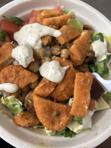 We got the following: -- (EK) SANTA FE CRISPY CHICKIN': Fried Chickin', lettuce, tomato, red onion, avocado, spicy mayo. Blackened (non-fried) upon request. You can get their sandwiches on a wheat bun, on a spinach wrap, or bread-free Kale style. I chose to get mine on a spinach wrap with fries. The fried "chickin" is really good and I enjoyed my wrap. -- (JC) MAC-N-CHEESE: Organic, non-GMO rice pasta, VG-Cheese sauce, bread crumbs She ordered something else as well, but this was the dish of hers that I tried. She took a few spoonfuls of this and then asked me to try it because she felt like it tasted odd. I tried it and immediately agreed--I tasted a weird caramel flavour. Why would mac&cheese have a caramel flavour to it? She could not agree on the caramel flavour, but she definitely felt that the flavour was off. Something was funky about this dish and neither of us liked it.