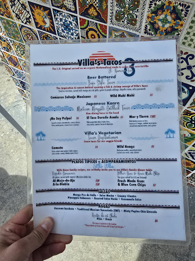 If you like seafood and you like Villa’s Tacos down at Fig and Ave 54, you’ll love their #3 location. You can get vegetarian tacos here, as you can at the other Villa’s; we tried the hongos (mushrooms), a savory option that almost melts in your mouth. But seafood tacos are #3’s raison d’etre. We like octopus, but at some restaurants the results can be hit or miss. Here the pulpo is fresh and tender, grilled (zarandeado) to perfection. The preparation is mild, putting the octopus flavor forward. For a spicier treatment, try the dorado asado, wild-caught mahi-mahi grilled and dressed with beans, cucumber, and salsa macha (hence the heat). It’s hard to rate service at a walk-up stand. Just before opening, Villa’s manager (jefe, owner?) gives a daily pep talk not only to his gung-ho crew but to his waiting customers. How can anybody not have the motivation to serve—and to be served! Atmosphere? Again, it’s a corner taco stand. But this one has vivid murals celebrating the Dodgers; Metro trains run right past the back door, and palm trees tower overhead; there are sun-drenched stools at stainless-steel counters and a picnic table in a relatively shady alcove. There’s also a beautiful LA branch library a block away and a good bookstore...