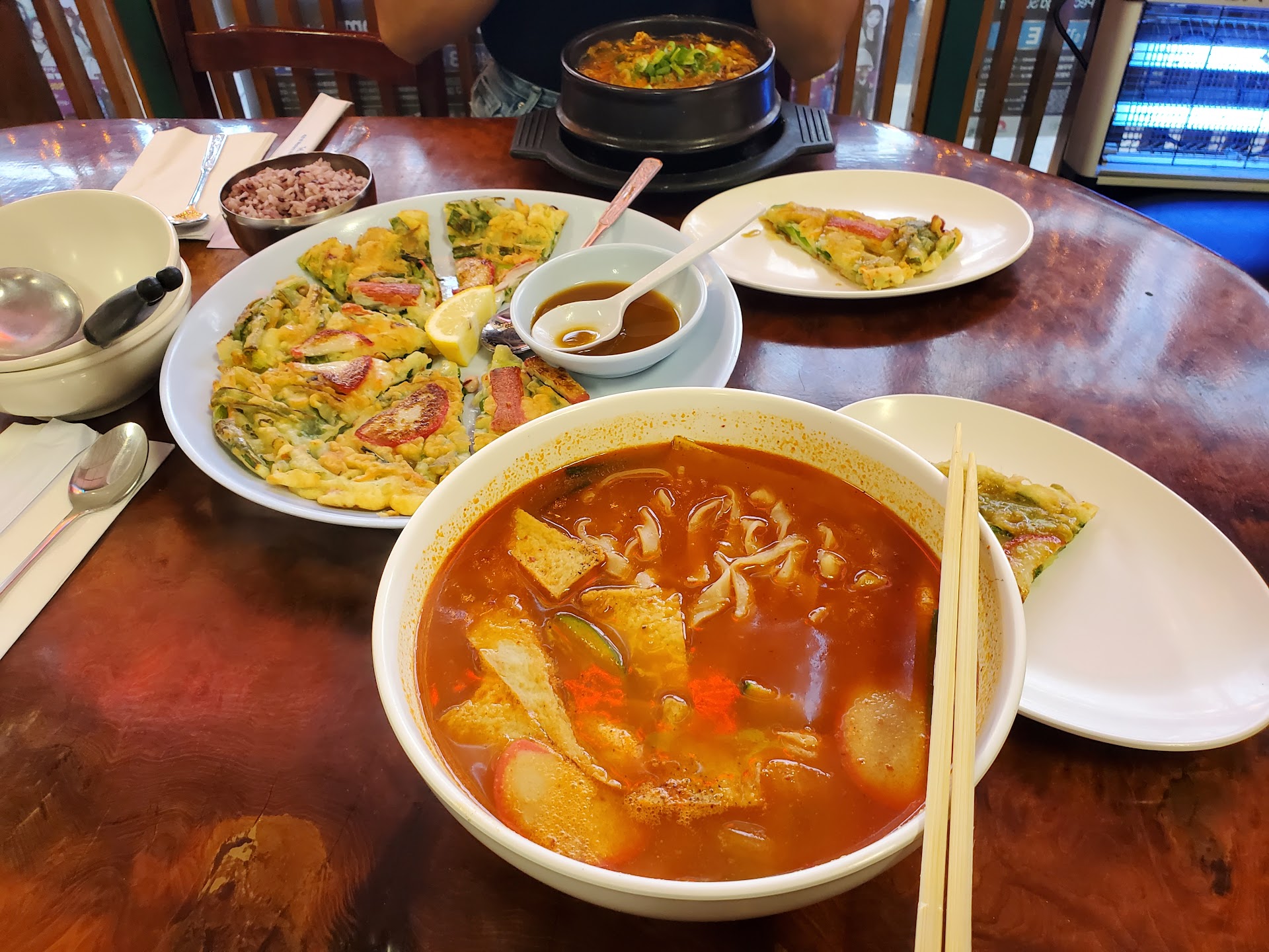 Read moreHands down best meal I had in L.A. Stumbled upon this humble eatery located in a little casual/run down strip mall, but the food does not reflect that at all. Quality handmade noodles to go in my spicy seafood soup (maybe noodles were a touch overcooked but probably just because my soup was superr hot)- and do you see the size of that bowl?? That was meant to feed two I'm sure now lol. But I finished it all with a little broth leftover (with some help from my friend). Her Spicy Beef Soup was also really delicious, with a very flavorful, deeply beefy broth, and a generous portion of beef - it has lots of ingredients in it including glass noodles, and came with a side of purple rice of course. The last thing we ordered to share was the seafood pancake, which was also really lovely. It could've been even crispier but the outside was a touch crispy with the interior being thick and fluffy. Lots of seafood in it though. On top of all this, we forgot the banchan was going to come too - which was also very abundant. There were so many dishes. All in all we were past stuffed (would have taken more leftovers but we had to leave town the next day so we wanted to finish what we could) - so we only had half the seafood pancake leftover. The ajumma serving us was so sweet and service was great. Can't wait to go...