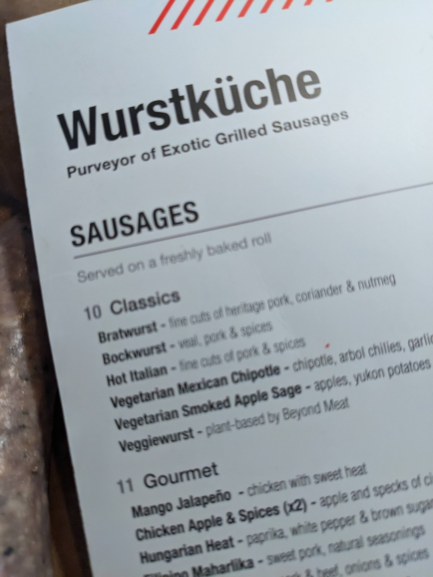 The next door was open and there was a small line formed right next to a display case of raw sausages and a number of beer taps. We were greeted by a guy that asked if this was our first time. We said it was and he gave us the full rundown of the menu in a nice concise, but sufficiently detailed manner. After learning how everything worked he made sure to emphasize that we could try the beers before we decided, so not to feel nervous for asking. It was very helpful.