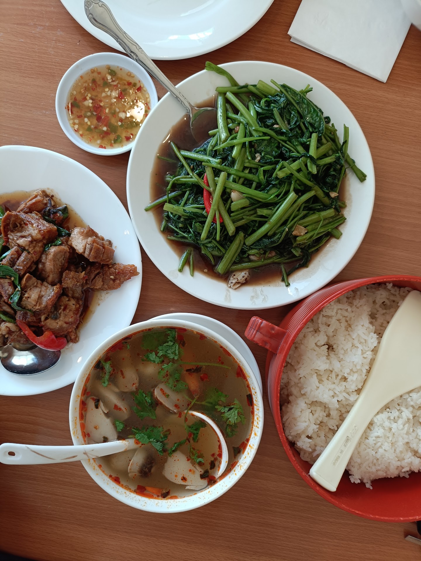 Not gone lie me and my brother where looking for a bathroom and the 7/11 across didn't have a bathroom so we went to this place just to buy the lowest item like a tea just so we can use the bathroom. My bro got the tea but I decided to get the fried pork belly since the lady at the counter recommended after I asked what was the most popular item here. I used the bathroom quick and let me tell you the bathroom was super clean compared to other establishments I visited. So I got done with my business and got the food to go, I hoped in the car and decided to give it a little nibble since I was driving all the way to San Diego. And not gone lie the first bite got me hooked idk how to explain it but I honestly love that dish with that little side of sour cup they give you. The veggies where crunchy. Not gone lie I literally stayed there in the parking lot with the car on devouring that plate. Made me want to go to Thailand and get me a wife out there lol. But great service, great food, the bathrooms are clean and I will recommend this to anyone specially that fried pork belly. Oh and that dish is so good it literally made me do my first food/restaurant review. Can't wait to go back...