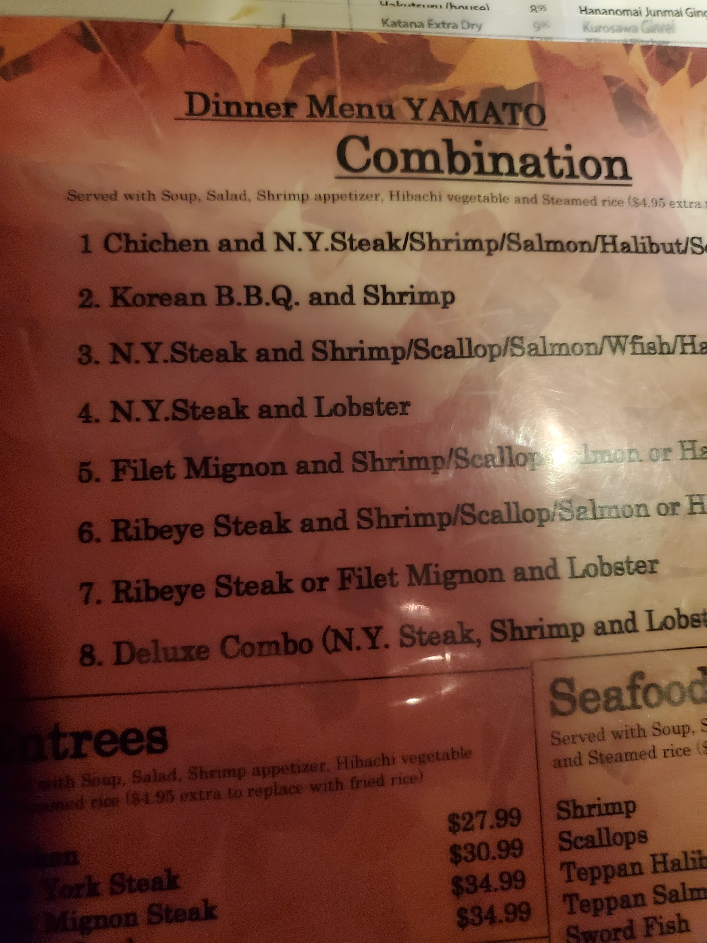 Read moreIf I could give less stars I would. I've been coming here for over 10 years and this place has gone downhill! I just had a late lunch here today and both my boyfriend and myself have food poisoning it feels like. We ate at the tepan grill and the carrots were sour! They were bad and they served them anyway. We're both in and out of the bathroom and barely made it home! The cook didn't cook the food right and my steak, which should have been MEDIUM RARE was cooked into beef jerky! The shrimp was cooked so long and was done 10 minutes before the rest of the meal that it was like rubber and dry and cold. This was the WORST experience! I drove up from south of Irvine in OC to this place that used to be great but now it's not. The carrots are absolutely rancid and the men's bathroom had what looked like sewer water all over the floor. This place is so overpriced and clearly neglected. They couldn't even be bothered to proofread the menu when they had it printed to reflect their seriously inflated prices. Unless of course there really is something called "chichen" that they serve. The top combo is apparently "chichen." I'll never spend my money here again. I'll definitely call the health...