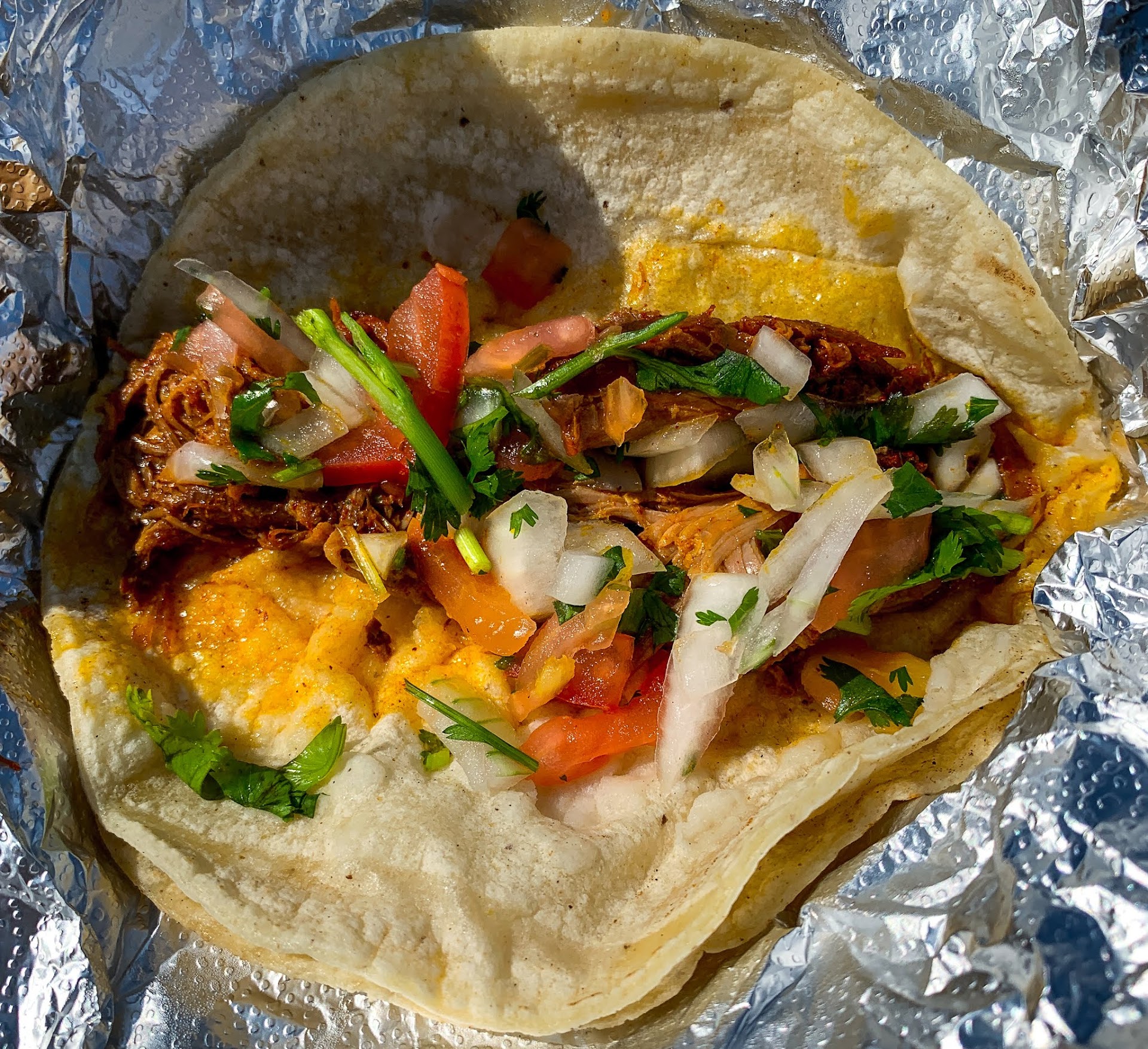 First, the "Cochinita Pibil Taco": double white corn tortillas pulled from a bag sweet citrus and achiote were the dominant flavors; the sour element was non-existent in the recaudo rojo to the point where it really did not taste like cochinita pibil at all (not to say what I ate was terrible, it just wasn't what I ordered) the pork used to make the pibil tasted funny and possibly was spoiled or had slight boar taint the taco comes topped with chopped tomatoes and fresh onions, not pickled onions (the latter being a more traditional accompaniment) the taco is served wrapped in foil