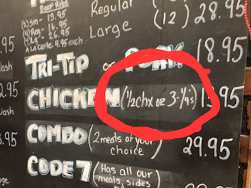 Edit: As you can clearly see in the picture, taken from their OWN menu, it says Chicken: (½ chx [I assume "chx" is their abbreviation for "chicken"] OR 3-¼'s). Very confusing, but most ppl would agree 3-¼'s means 3 quarters (leg-thigh quarters, which you can get a 10-lb. bag at the store for $5). Just shows how lazy and incompetent the staff is. It's right there on the menu and not one of these two women serving us would look at the menu or I would be glad if you told me what 3-¼'s meant! Haven't been back since and don't plan on returning anytime soon. I can make better BBQ myself cheaper at home.