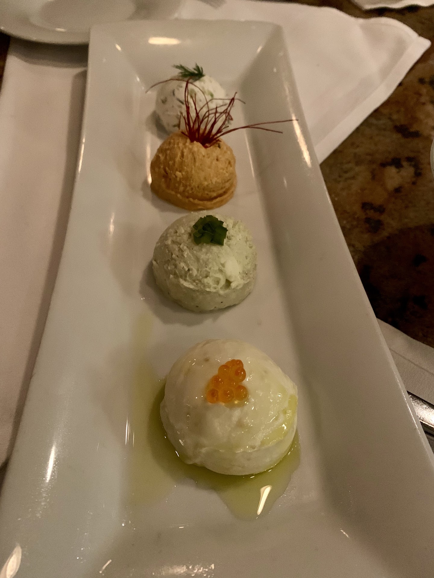 Wedding banquet Hummus sampler on crostinis ~Okay. 3-4 different hummus options on pieces of crostini.